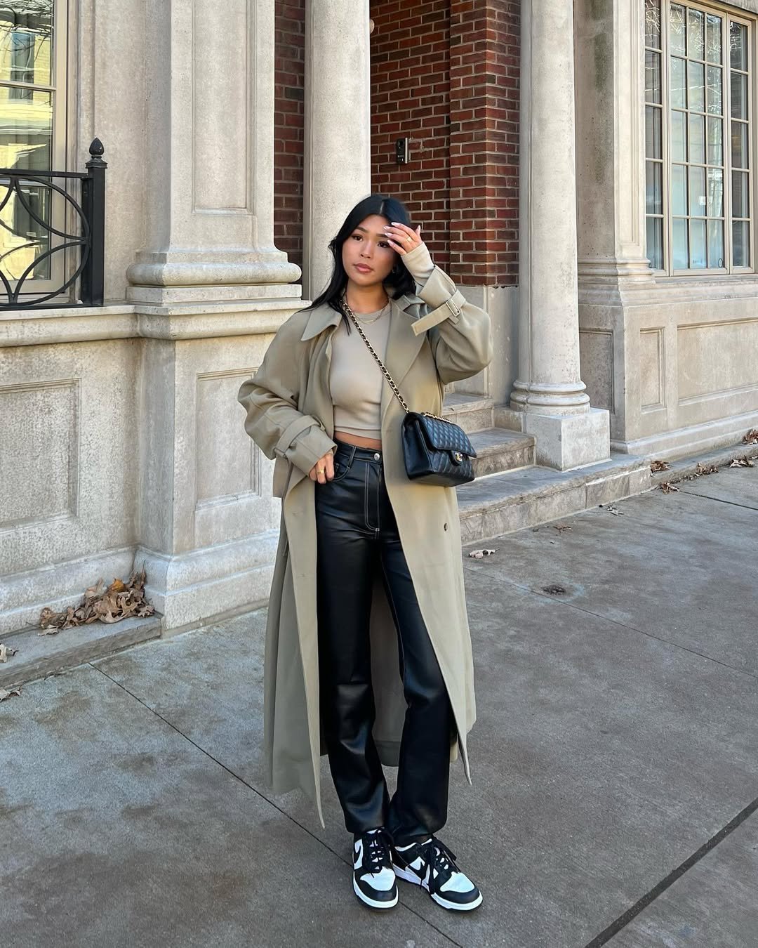 A trench coat over sleek black leather instantly raises the style stakes. The neutral top keeps things soft, while the structured coat brings a sense of balance to the sharper textures of the leather pants. It’s modern, confident, and quietly powerful.