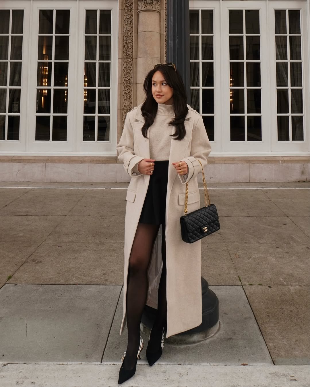 There’s something about a long cream coat paired with a sleek black mini that instantly feels sophisticated. The neutral layers keep the outfit refined, while sheer tights and pointed heels add that polished evening touch.