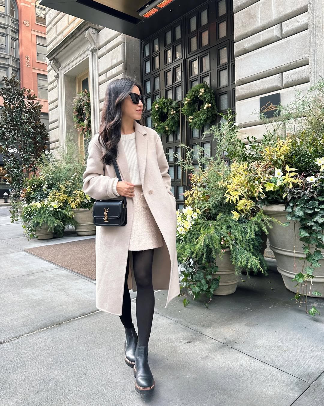 Soft neutrals always bring a certain calmness to an outfit. This coat layered over a textured knit dress and tights feels cozy yet refined, the kind of look that works beautifully on colder city days.