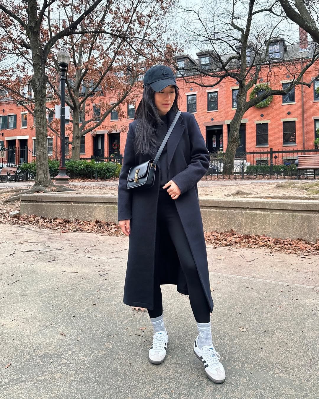 White sneakers and cozy socks break up the dark tones just enough to keep it fresh. It’s one of those outfits that feels both practical and stylish, perfect for long city walks or weekend errands.
