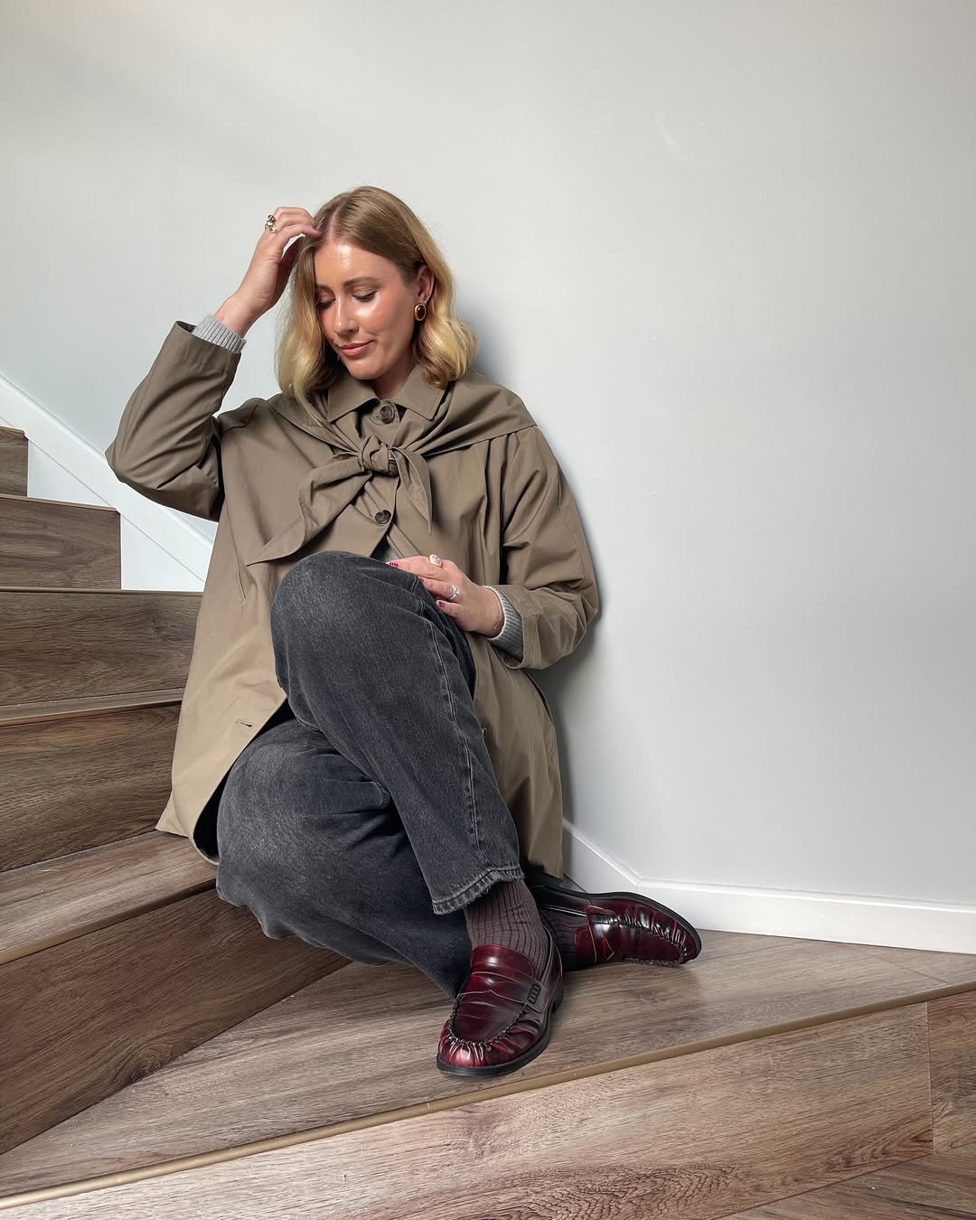 There’s a relaxed, almost vintage charm to this trench look. The shorter coat paired with washed grey denim feels casual, while the deep burgundy loafers introduce a rich pop of color.