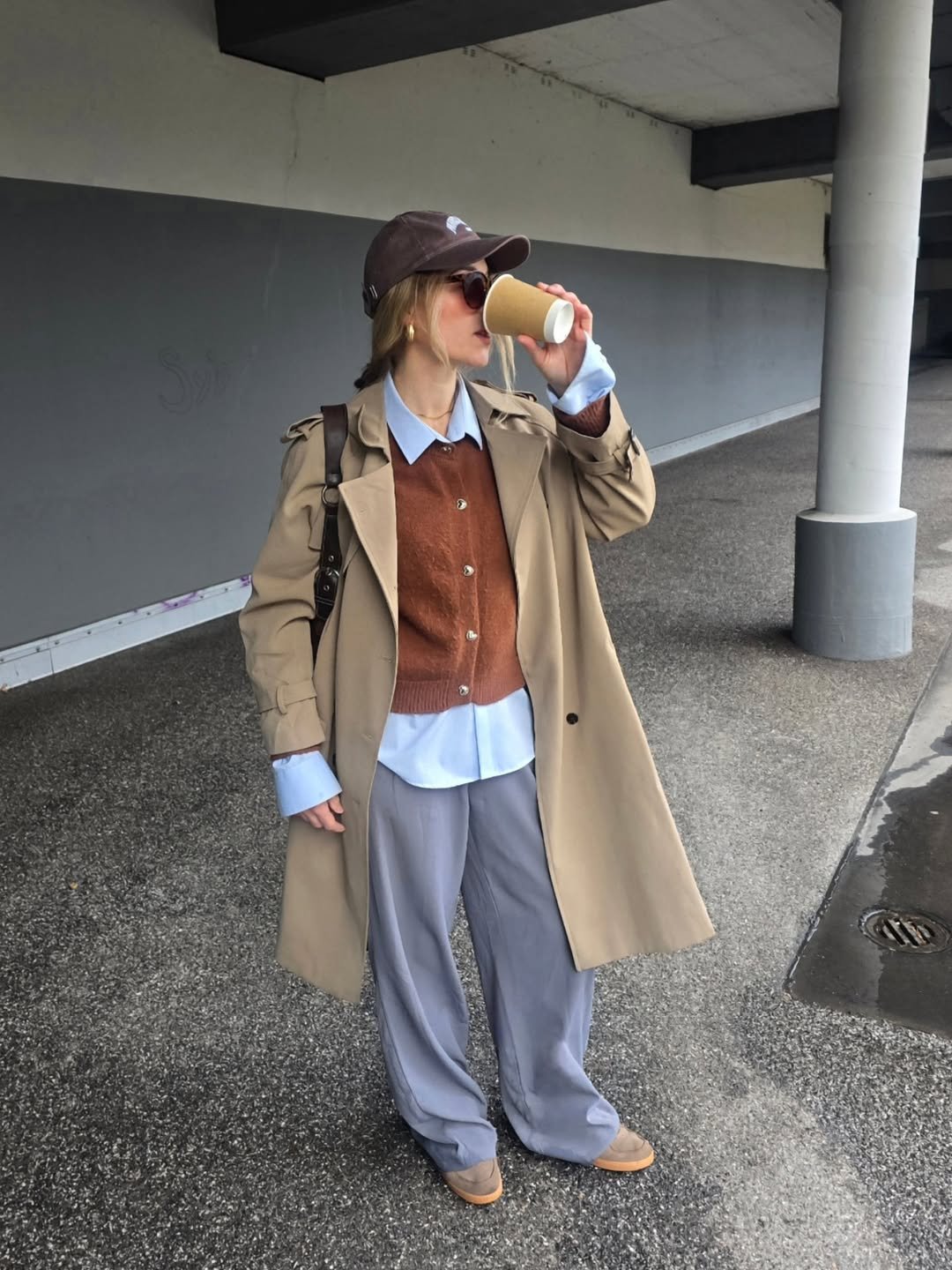 There’s something charming about a layered outfit that looks slightly undone in the best way. A soft brown cardigan peeks out from beneath the trench, layered over a pale blue shirt that adds a subtle contrast. The combination feels cozy yet thoughtfully styled.