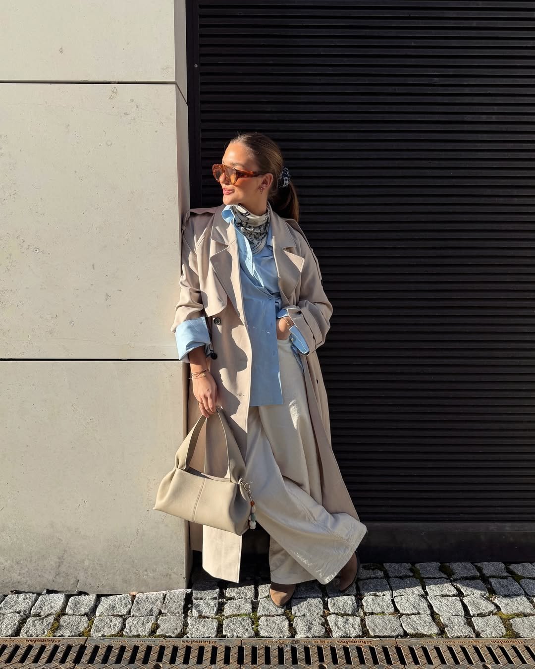 This look feels like a quiet moment in the sun, effortless and polished at the same time. The classic beige trench layered over a soft blue button-down and creamy trousers creates a palette that feels fresh without trying too hard. It’s the kind of outfit that looks just as good leaning against a city wall as it would strolling through a weekend market.