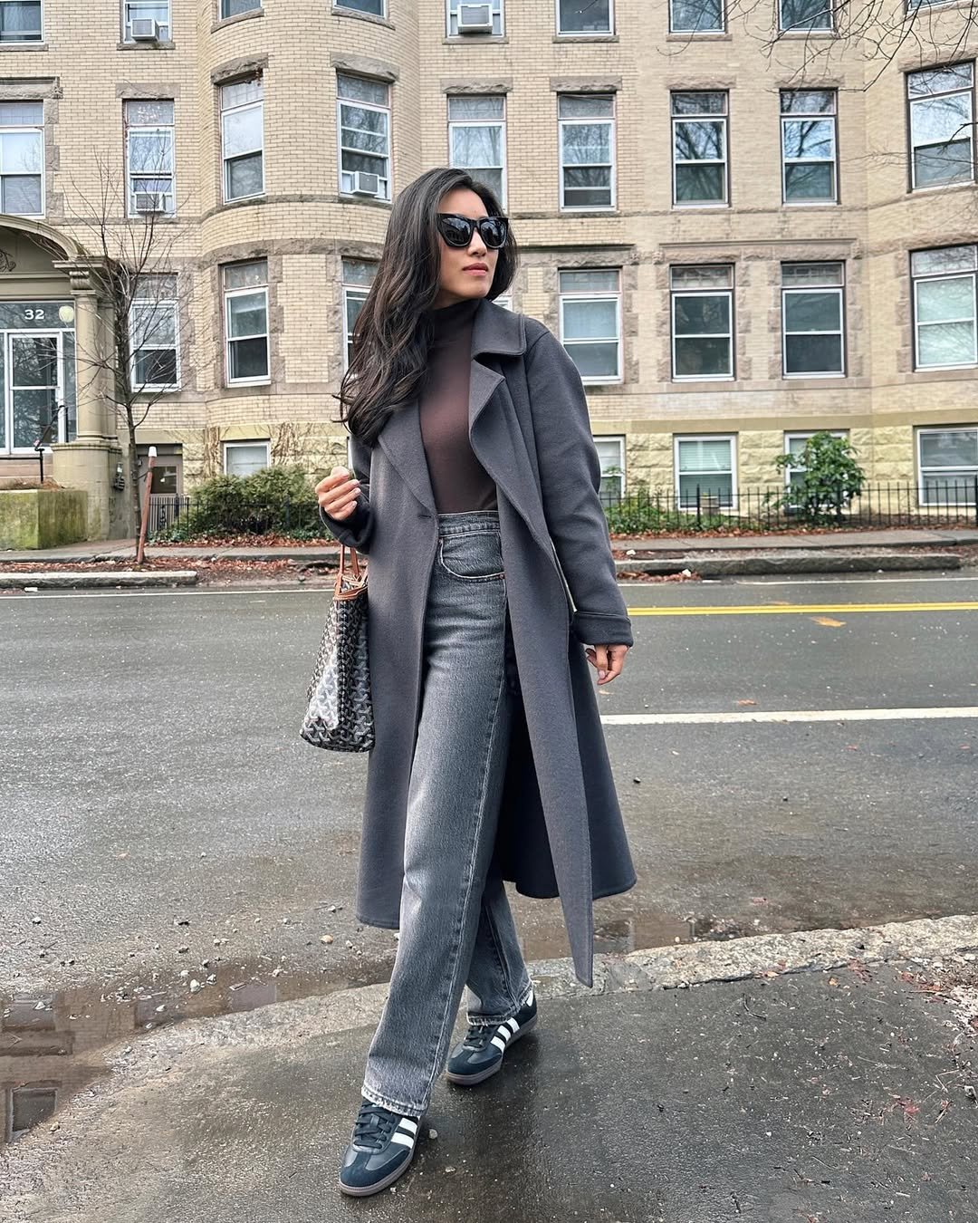 Grey denim and sporty sneakers keep the outfit grounded in everyday wear. It’s the kind of effortless street style that feels polished without looking overly styled.