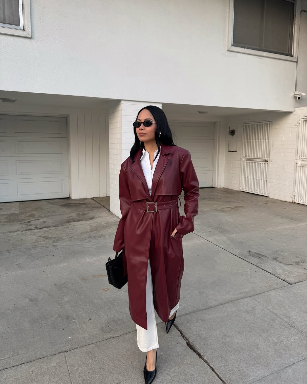 This look takes the classic trench and gives it a bold twist. The deep burgundy leather coat instantly commands attention, cinched at the waist for a strong, tailored silhouette.