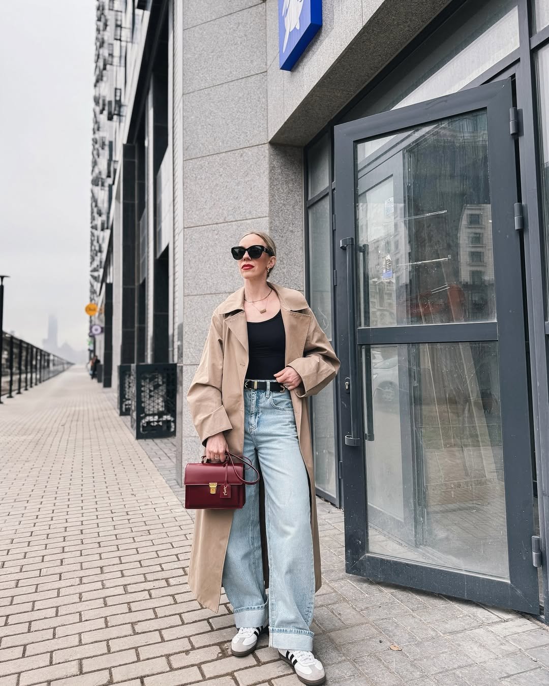 The trench coat ties everything together, adding structure without taking away from the relaxed feel. It’s the kind of outfit you’d wear while grabbing a latte and wandering through the city, stylish without even trying.