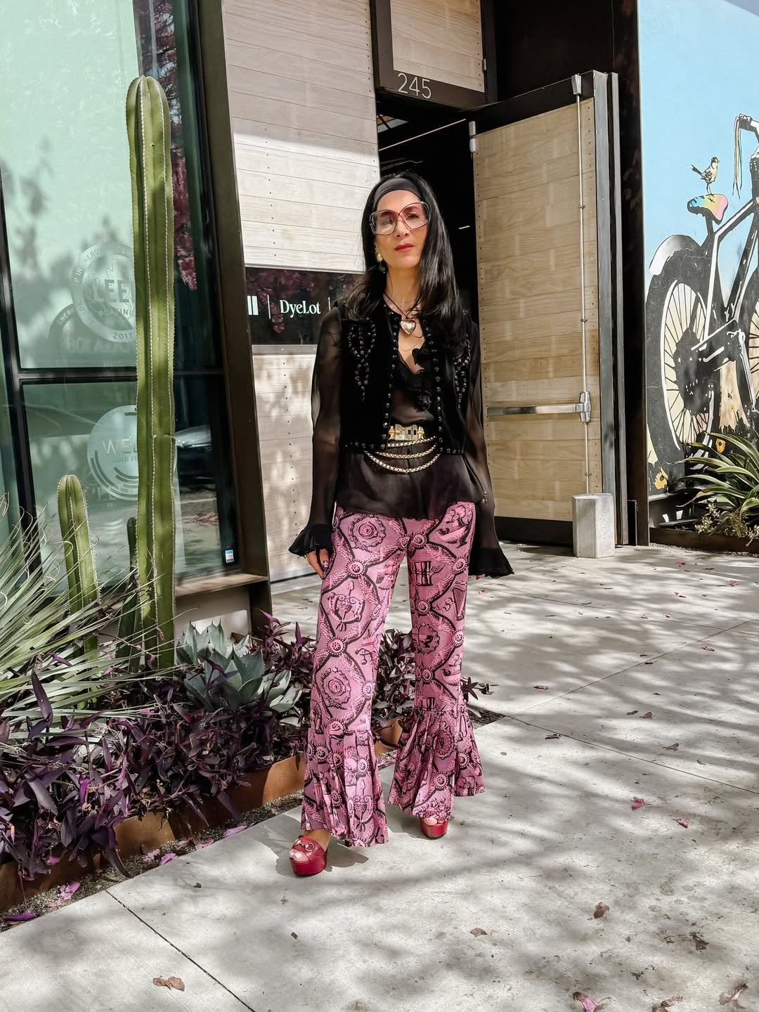 A sheer black blouse layered over a dark base paired with pink patterned flares is not for the faint of heart, and that’s exactly why it works. The chain belt and platform heels lean into the drama, giving full retro diva energy.