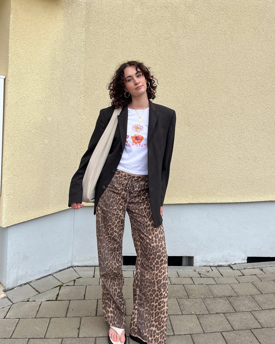 An oversized black blazer over a simple tee and leopard wide-leg pants is such a cool-girl take on vintage. It nods to 90s street style while still feeling current.