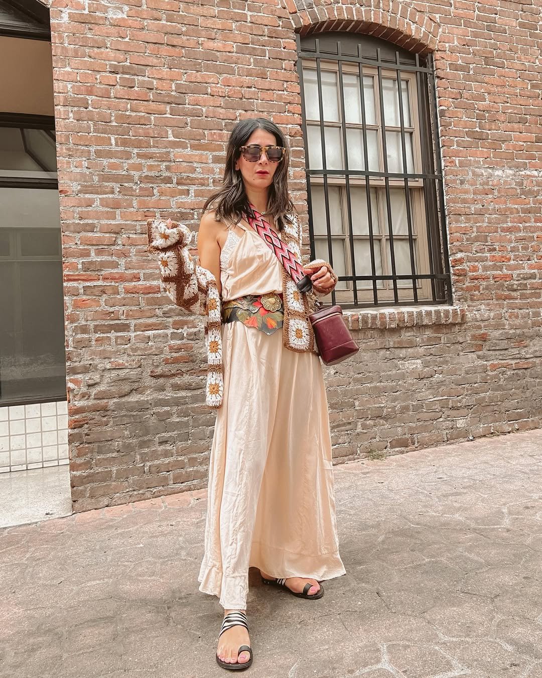 A champagne slip dress layered with a daisy crochet cardigan feels like a love letter to 70s wanderlust. The wide statement belt and patterned strap add texture, while the small leather bucket bag keeps it grounded.