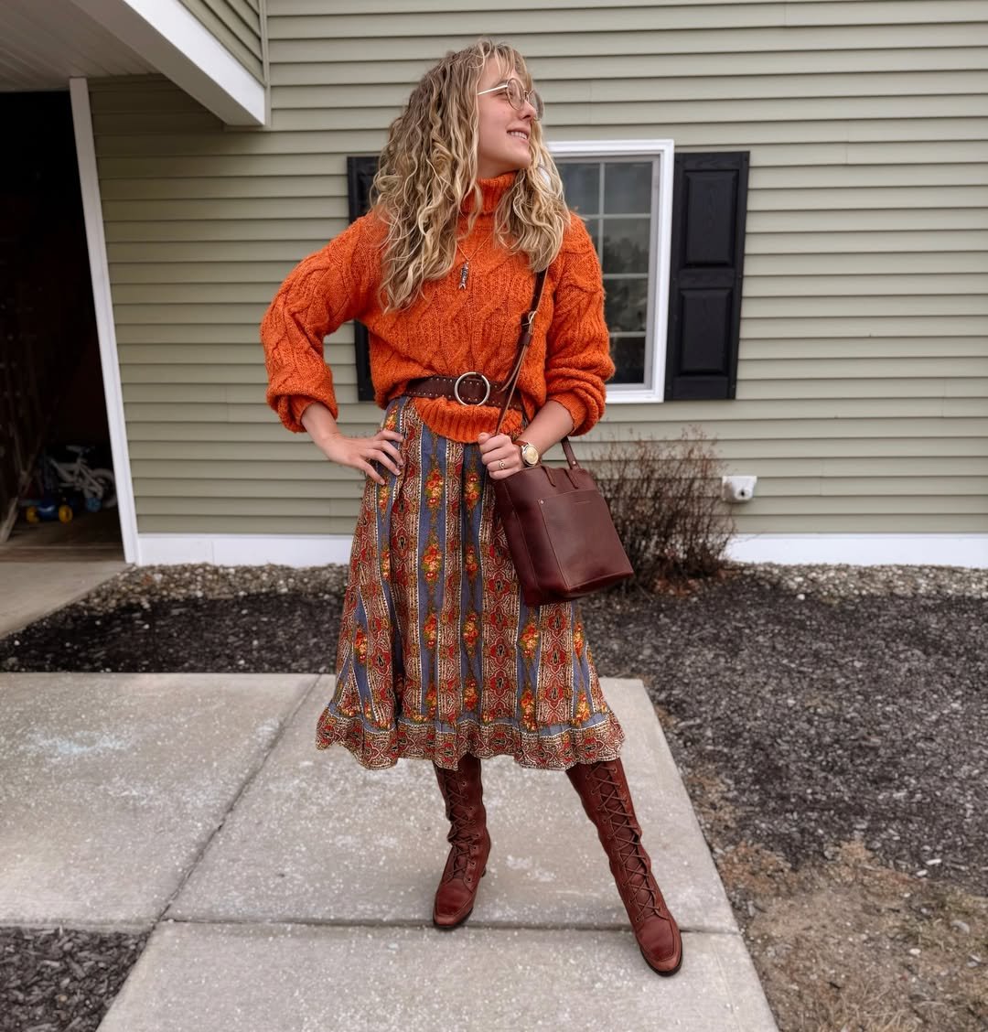 A chunky rust turtleneck tucked into a floral midi is autumn done right. The wide belt defines the waist, and the tall lace-up boots bring that 70s revival energy we keep coming back to. It’s cozy, but it still holds shape.