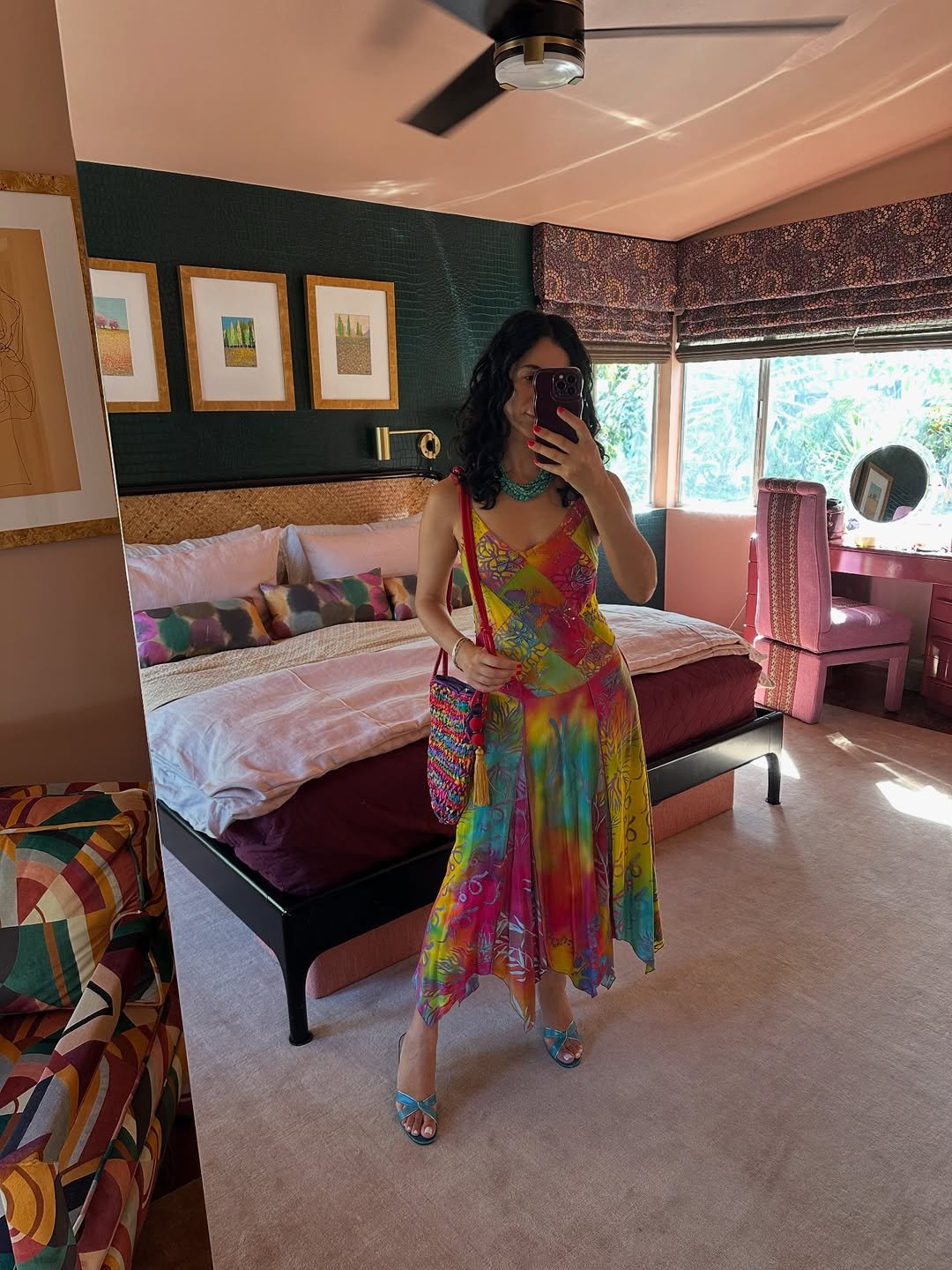 This vibrant midi dress is pure joy. Swirls of citrus, fuchsia, and turquoise blend together in a fluid silhouette that moves with every step. The turquoise heels and woven crossbody echo the palette without overwhelming it.