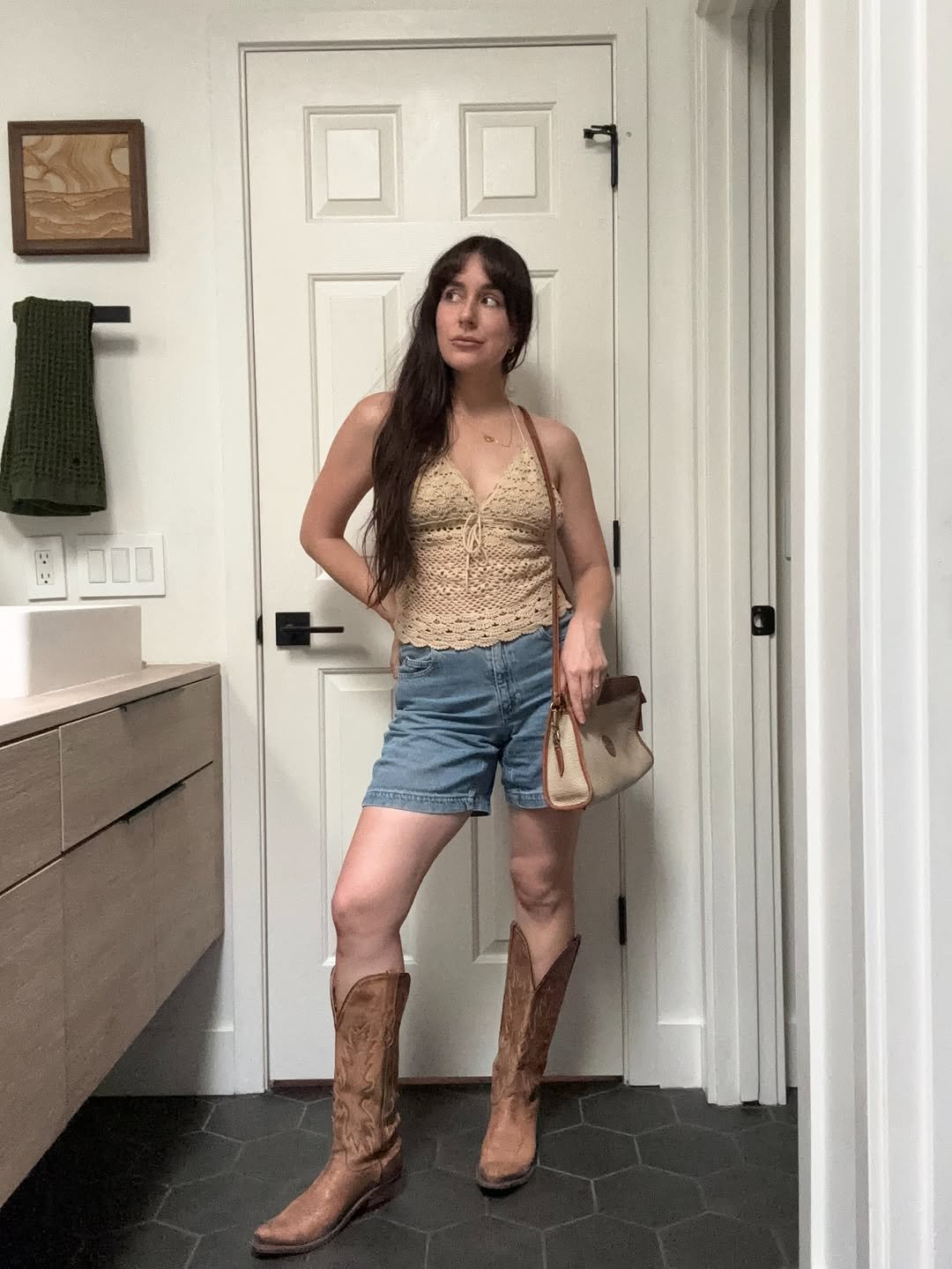 A beige crochet halter with structured denim shorts is summer nostalgia in outfit form. The delicate knit texture contrasts beautifully with sturdy cowboy boots, creating that soft-meets-strong vibe.