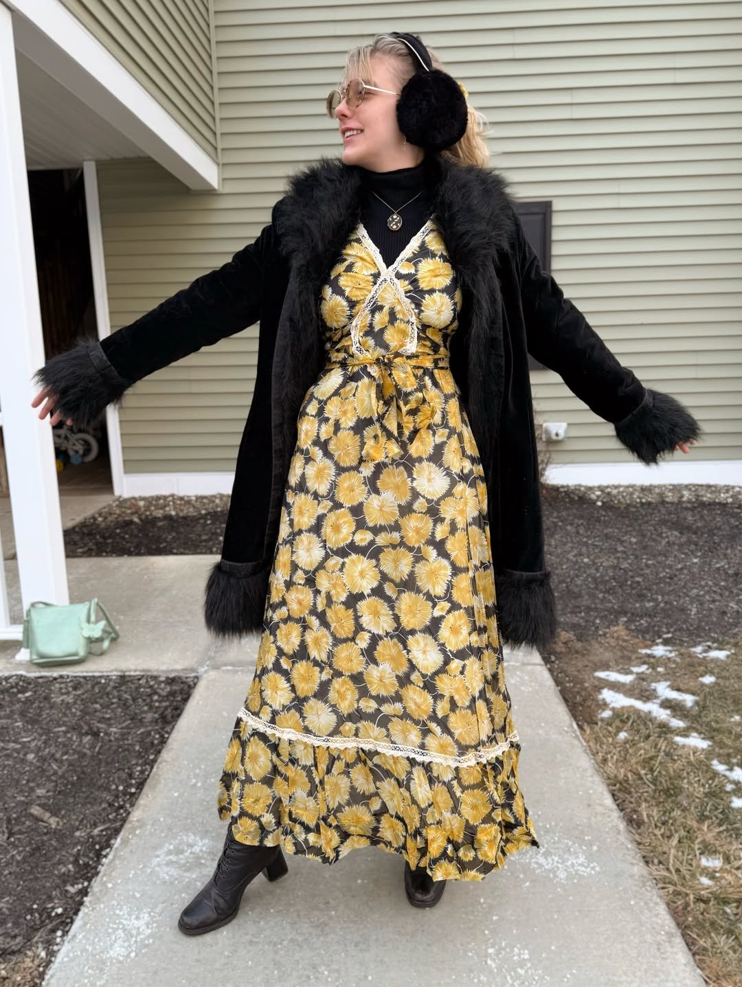 A sunflower-toned dress layered under a black coat trimmed in plush fur feels theatrical in the best way. The lace trim, the dark turtleneck underneath, even the earmuffs, it’s all giving vintage winter glamour.