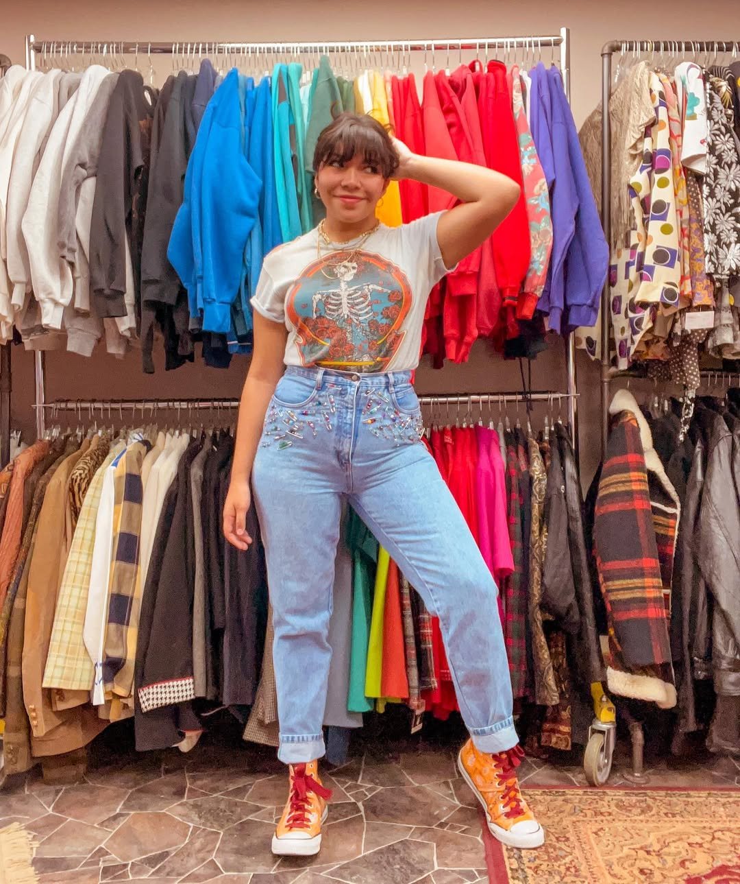 A vintage graphic tee tucked into high-waisted jeans always wins, but the rhinestone detail on these pockets takes it up a notch. Add bright high-top sneakers and suddenly it’s a full personality moment.