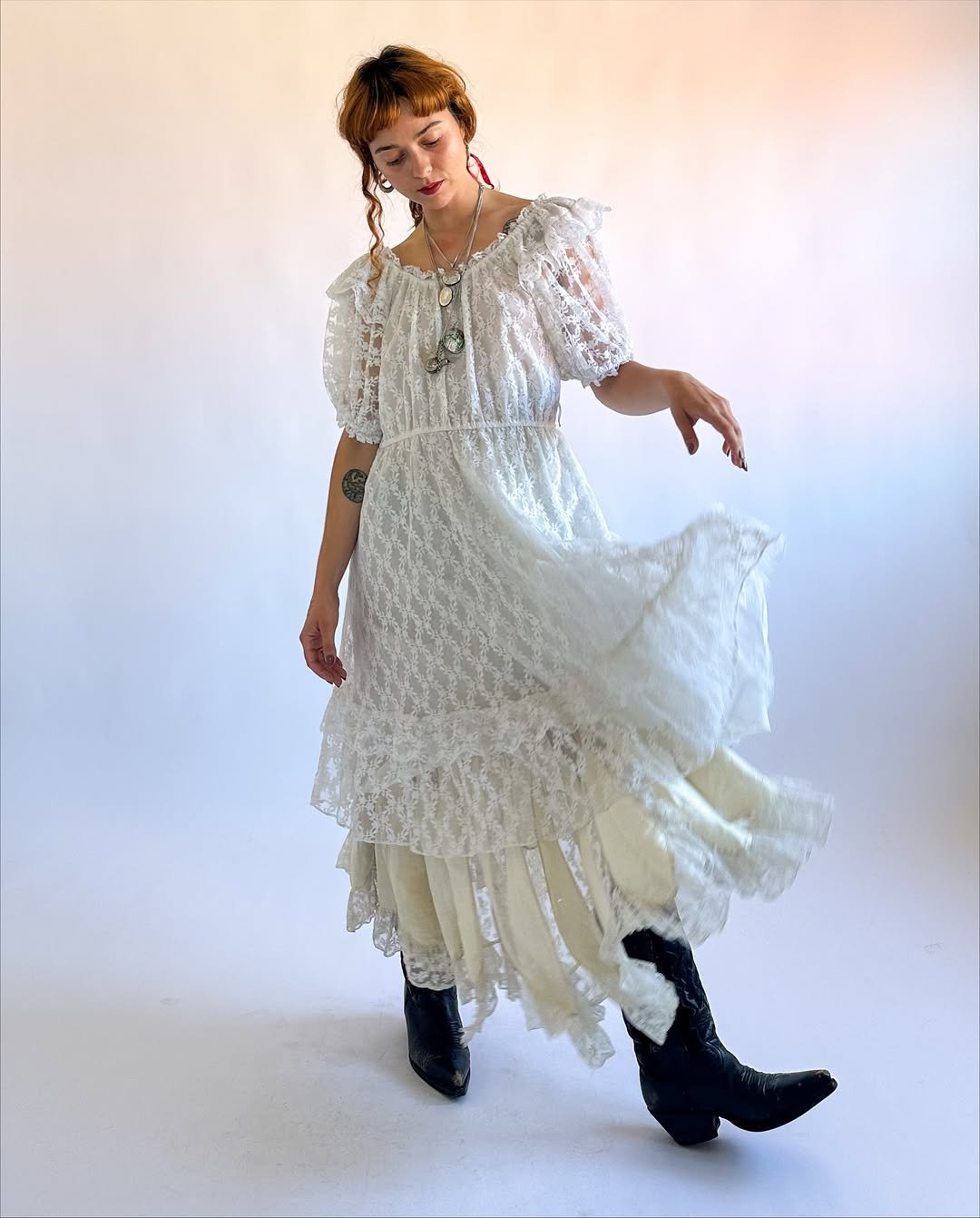 There’s an ethereal quality to this flowing white lace dress. The puff sleeves, tiered hem, and sheer layers feel straight out of a 70s folk festival. Then come the black western boots, and suddenly it’s grounded.