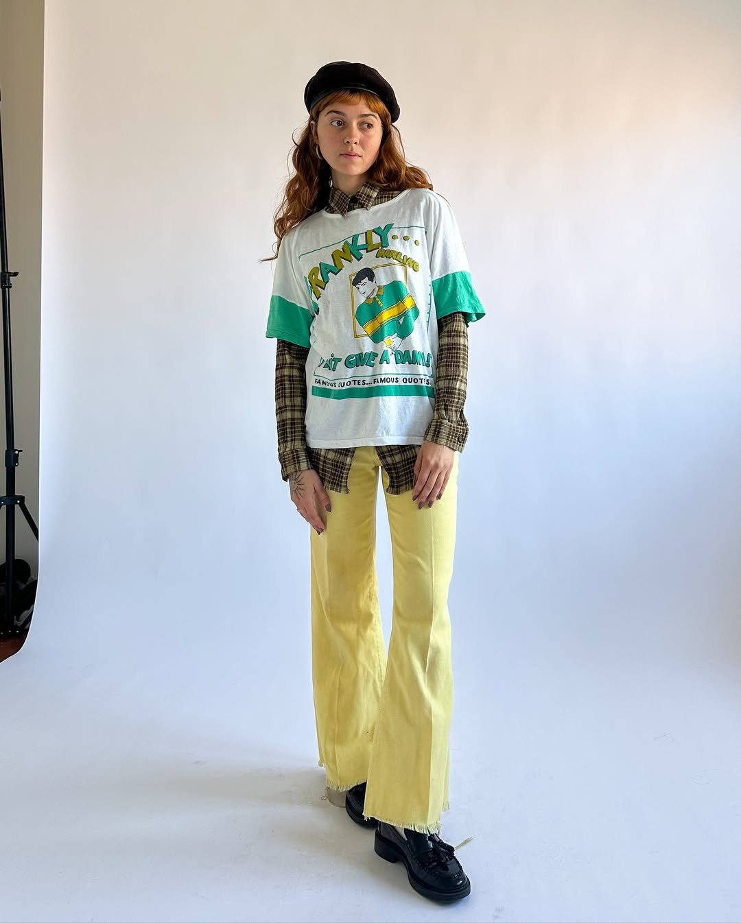 A plaid shirt layered under a bold graphic tee brings that thrifted, lived-in charm. The pale yellow flared trousers add just enough color to keep things interesting, while the beret adds a Parisian wink.