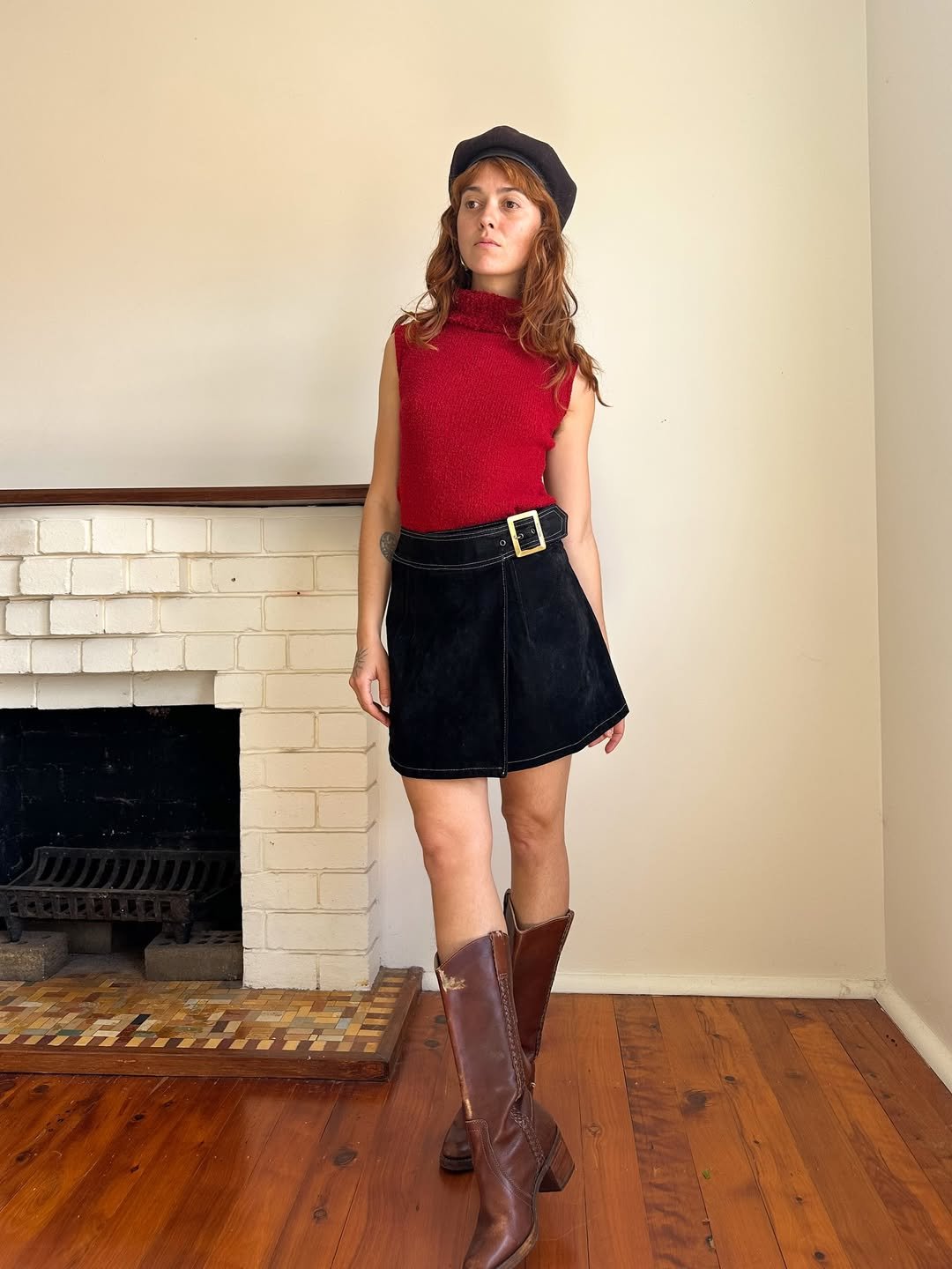 A red sleeveless knit tucked into a black A-line mini is such a clean, striking combination. The wide belt and tall brown boots bring that 60s mod influence without feeling costume-like.