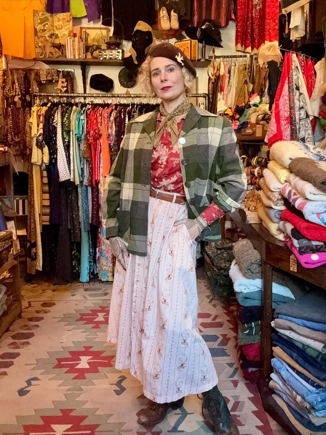 Layering a red floral blouse under a green plaid jacket shouldn’t work this well, and yet it absolutely does. The long striped skirt adds another dimension, and somehow it all feels cohesive rather than chaotic.