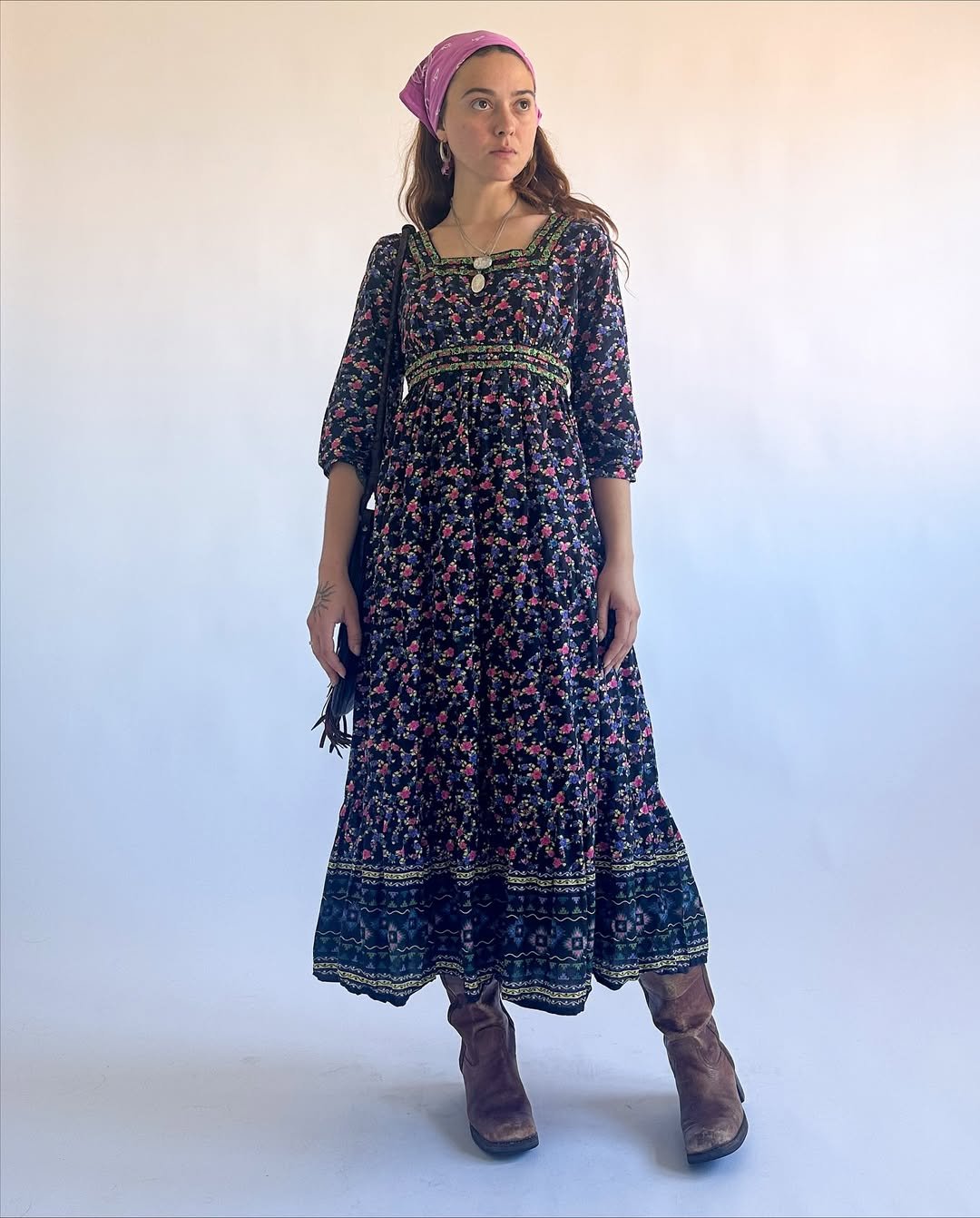 A floral midi with a bandana instantly brings that 70s prairie spirit to life. The fitted bodice and gathered skirt create movement, while the boots ground it with a bit of grit.