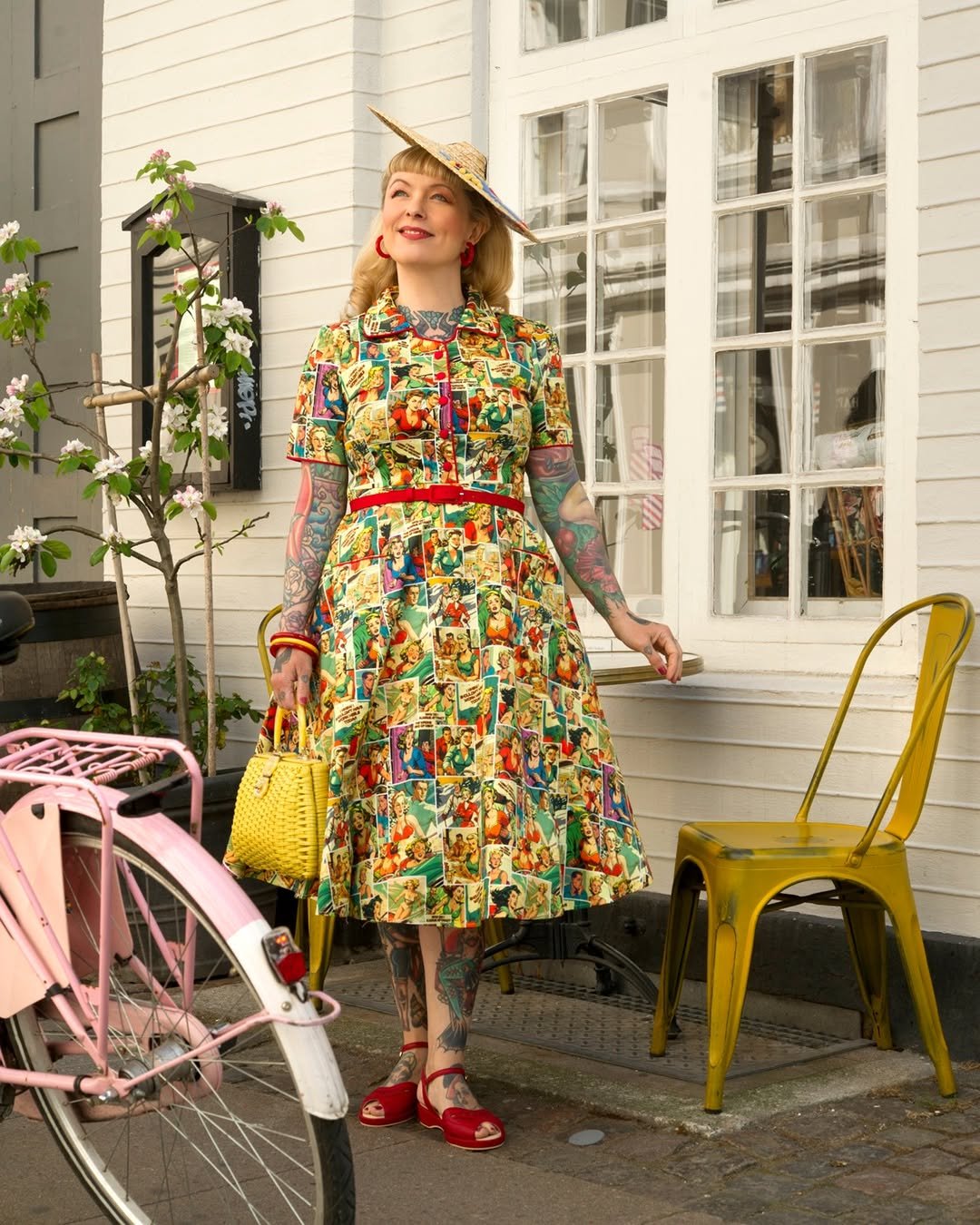 This dress is pure 1950s delight. The structured collar, nipped-in waist, and full skirt create that timeless hourglass shape, but the comic strip print keeps it playful and fresh. Add a slim red belt and matching shoes, and suddenly it’s a full story moment.