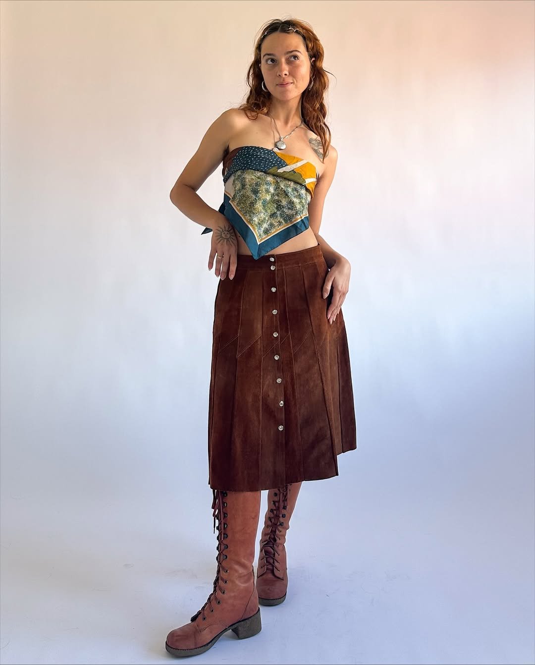 A silk scarf turned bandeau paired with a chocolate suede button-front skirt feels very 70s muse. The earthy palette, the tall lace-up boots, the relaxed posture, it all whispers laid-back confidence.
