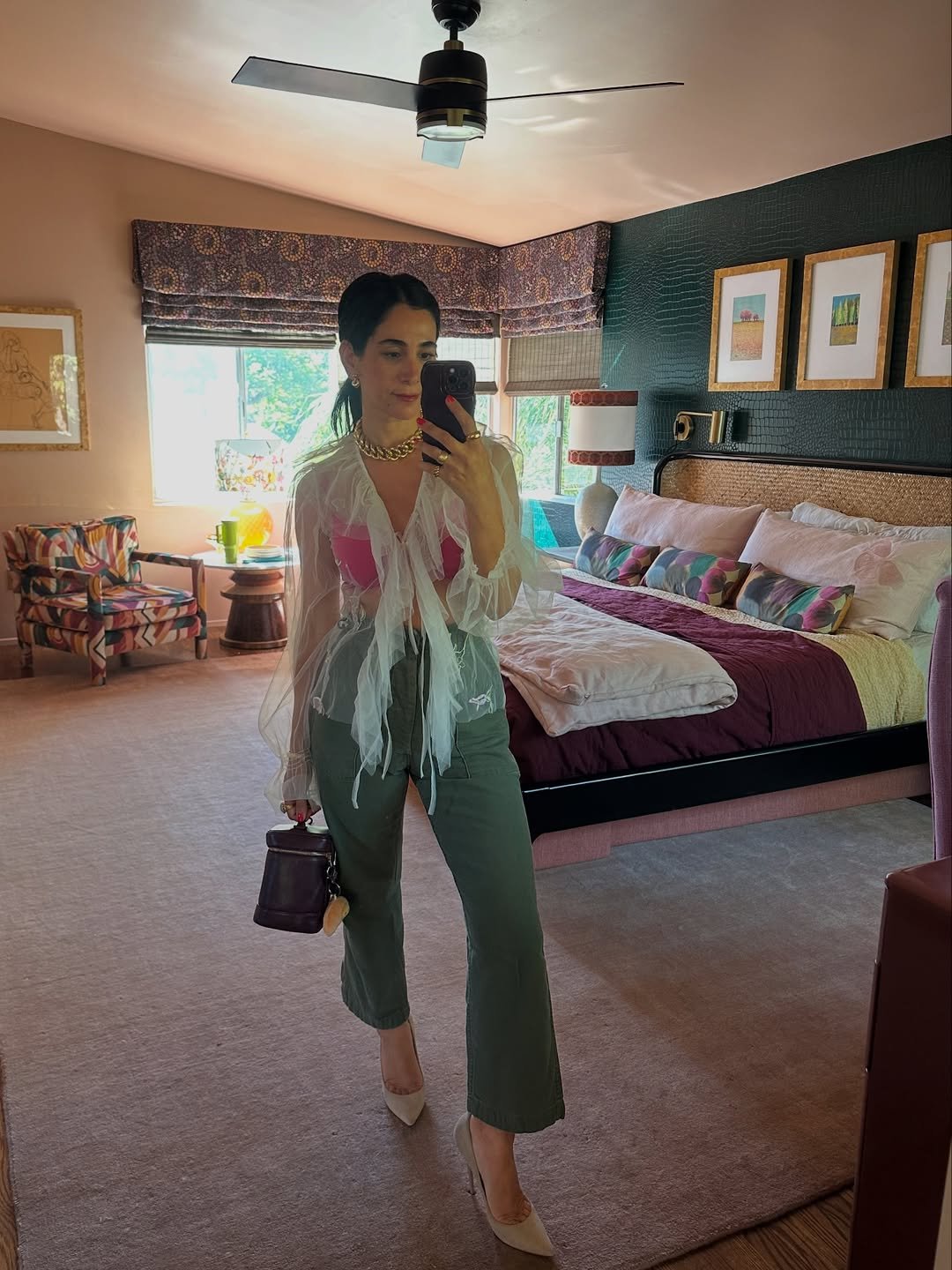 A sheer, ruffled blouse floating over a bold pink bralette instantly sets a mood. Paired with olive trousers and pointed heels, it becomes less boudoir, more editorial. The gold chain necklace adds just enough weight to anchor the look.