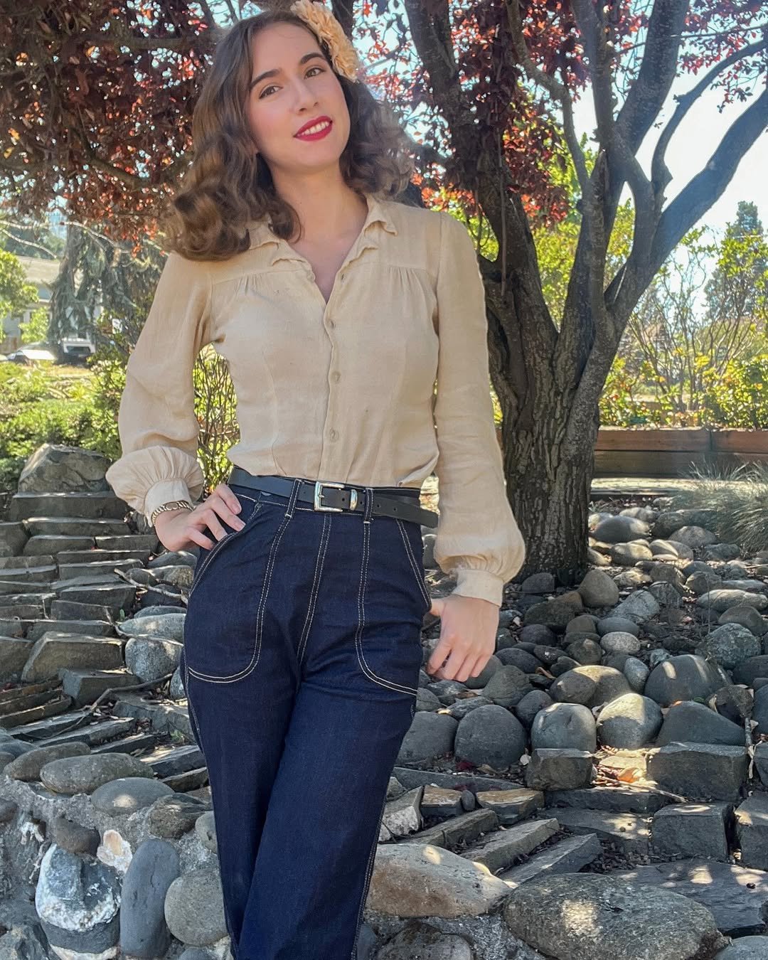 A cream blouse with gentle gathers at the shoulder paired with deep indigo jeans is such a satisfying combination. The puffed sleeves add romance, while the contrast stitching on the denim gives it that retro utility edge.