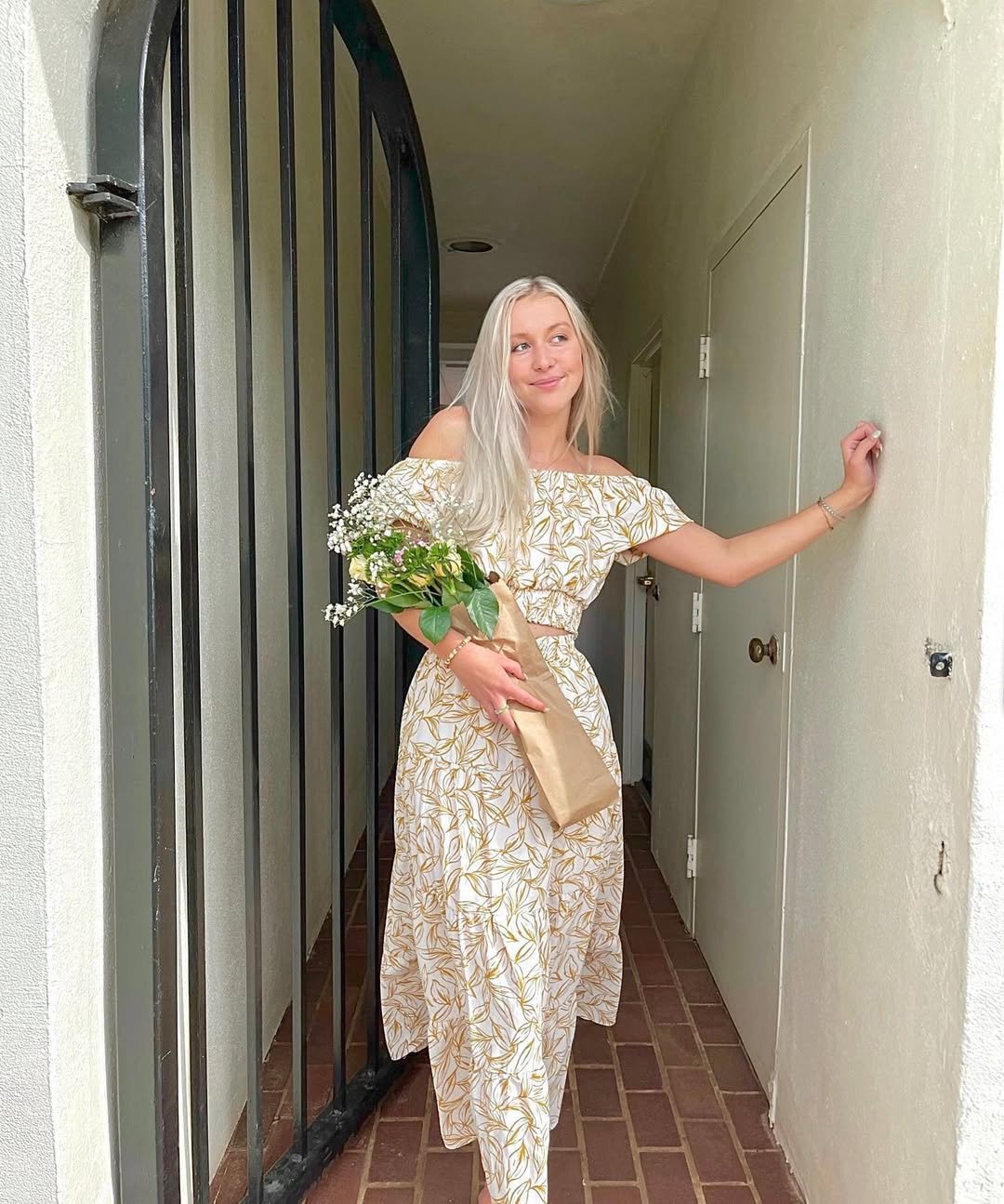 An off-the-shoulder midi in a muted leaf print feels gentle in the best way. The cinched waist and flowing skirt create movement, and the bouquet wrapped in brown paper almost becomes part of the outfit itself. It’s romantic without trying too hard.