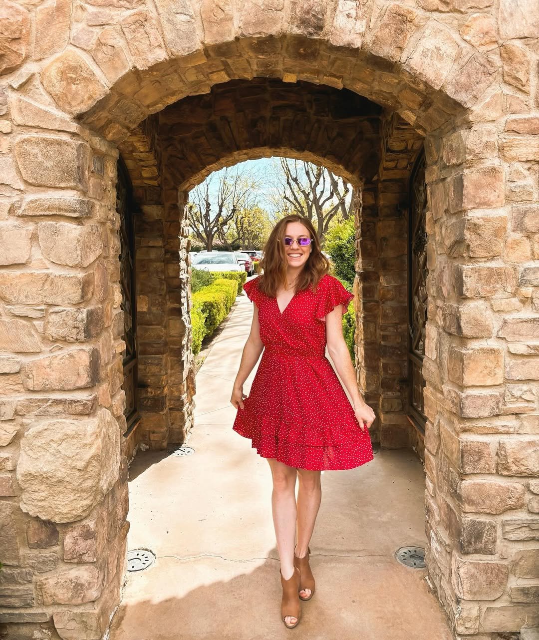 There’s something about a red wrap dress under a stone archway that feels straight out of a summer romance. The flutter sleeves, tiny white print, and flouncy hem bring that carefree charm, while the tan peep-toe booties keep it grounded and wearable. It’s playful, but still polished.