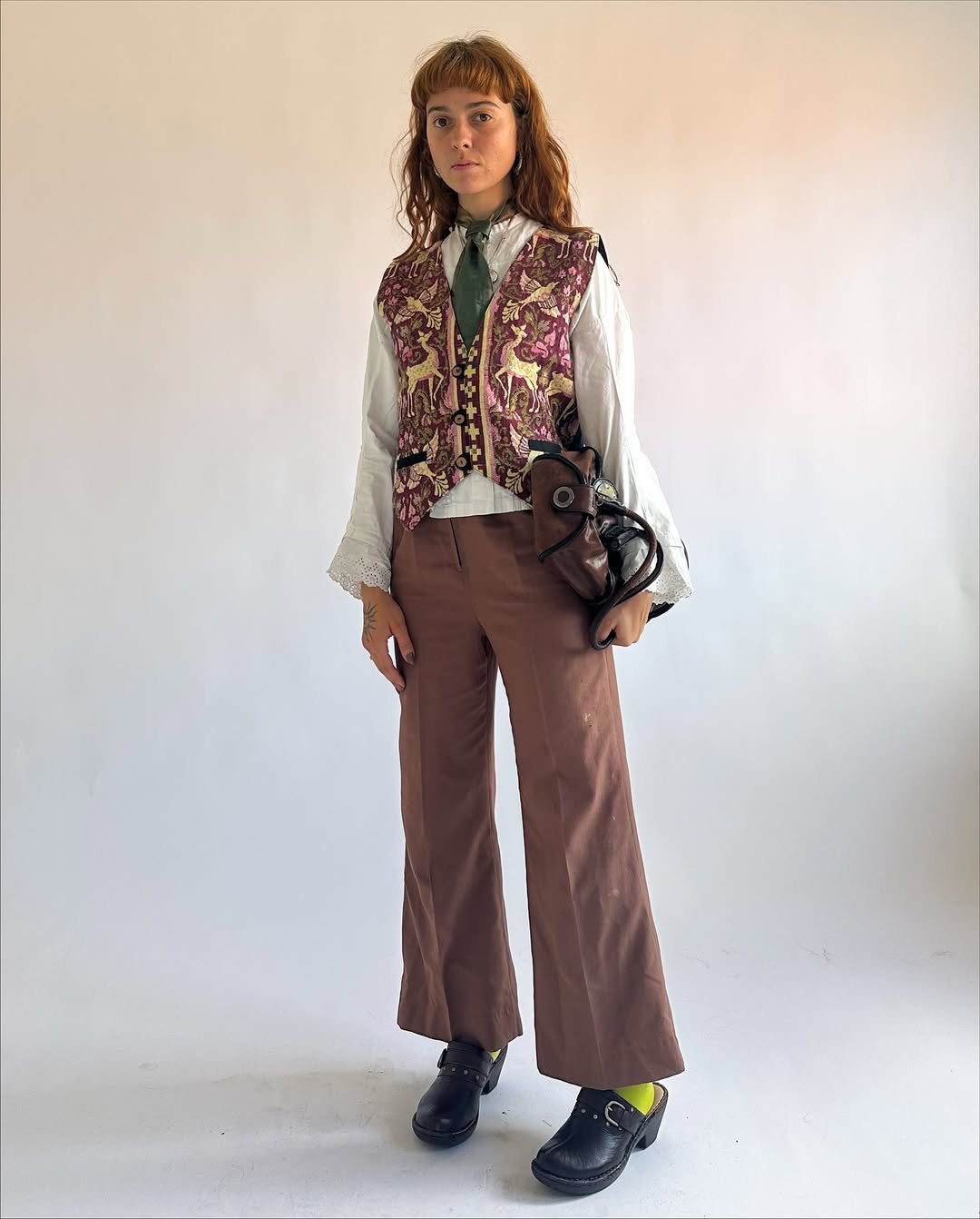 There’s something so romantic about a brocade vest layered over a crisp blouse. The rich tapestry pattern, paired with tailored brown trousers and a slim tie, feels borrowed from an old European novel.