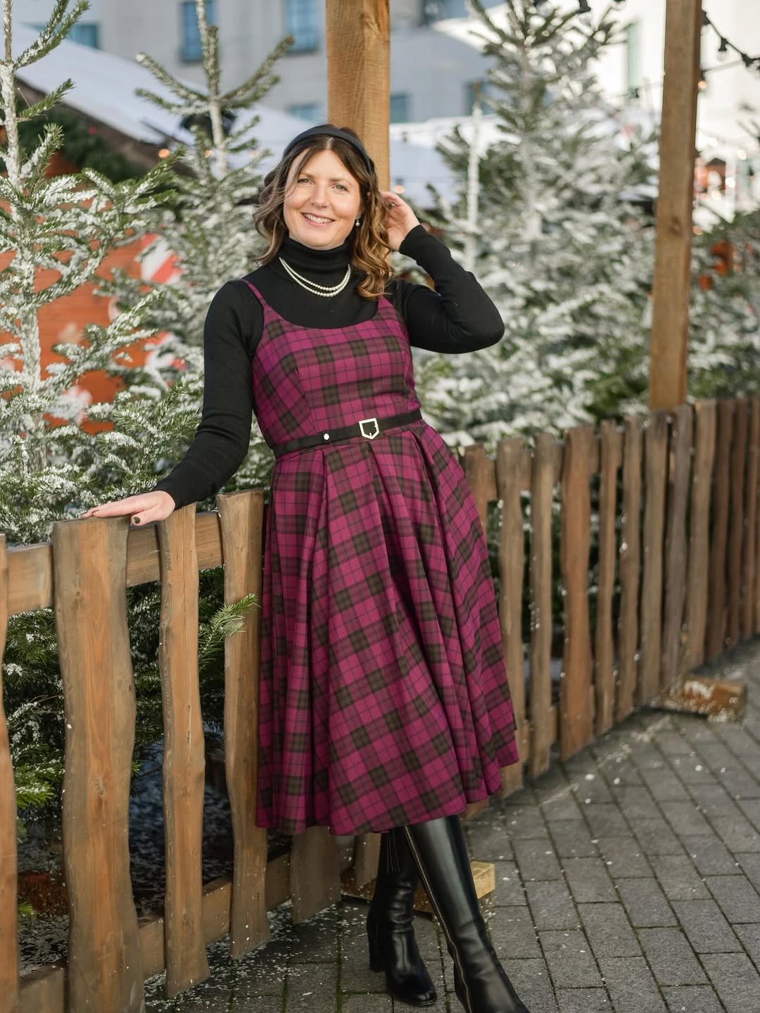 A berry-toned plaid pinafore layered over a sleek black turtleneck feels like holiday nostalgia done right. The structured bodice, belted waist, and full skirt create that classic silhouette, while the tall black boots give it polish. Snow-dusted evergreens in the background only make it better.