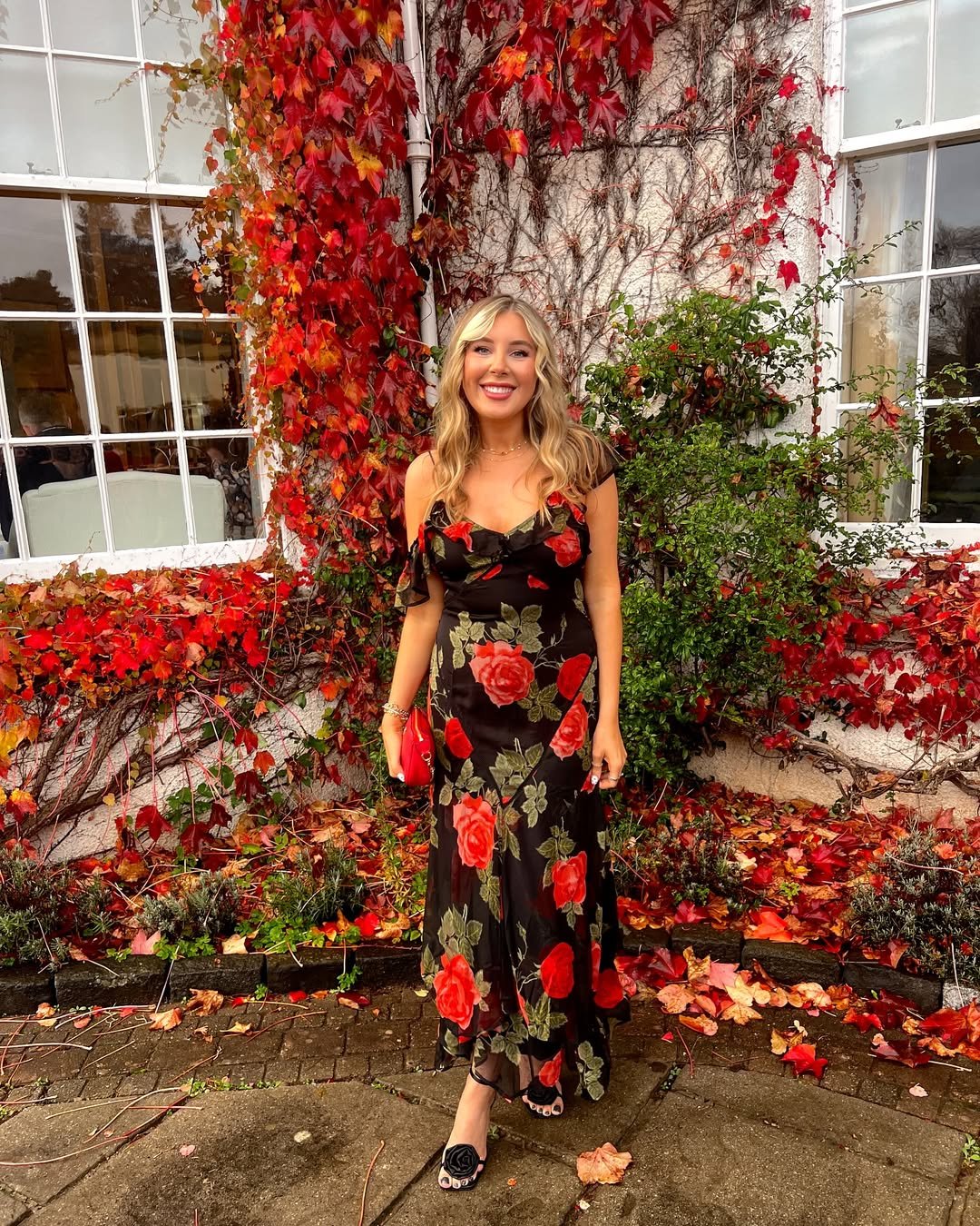 A black dress with bold red roses always carries a little drama, and this one delivers it beautifully. The rich floral pattern pops against the dark fabric, creating a look that feels romantic and slightly vintage.