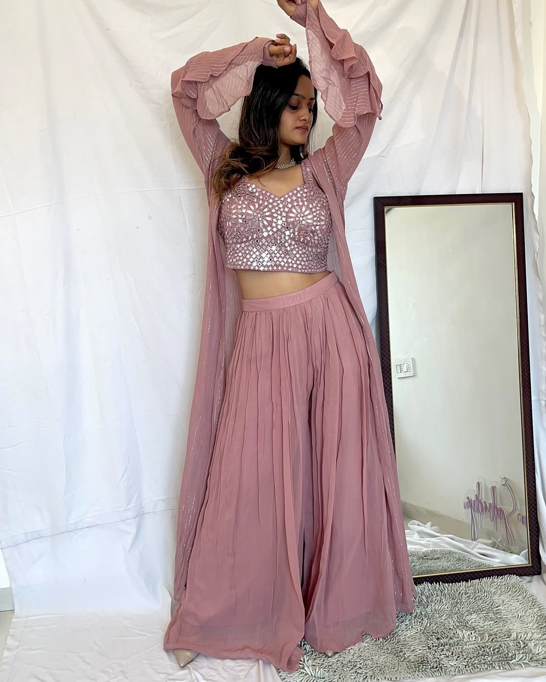 Blush tones always feel right at a wedding, but this co-ord set adds a playful twist. The intricately detailed crop top paired with the flowing skirt and sheer jacket brings texture and movement to the whole look.