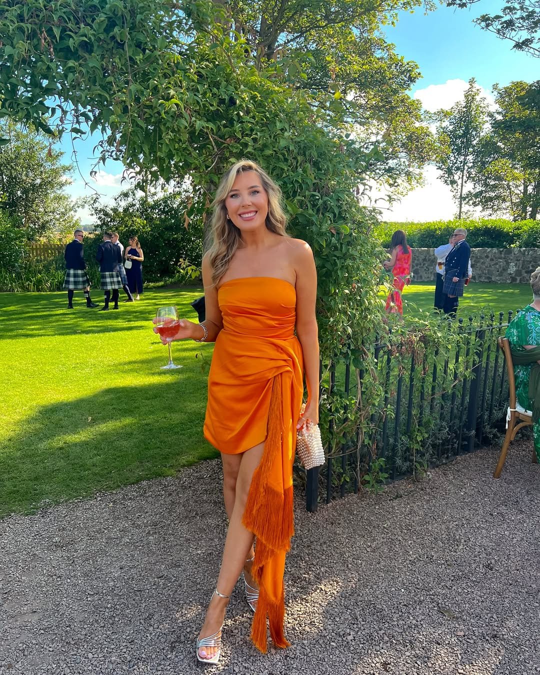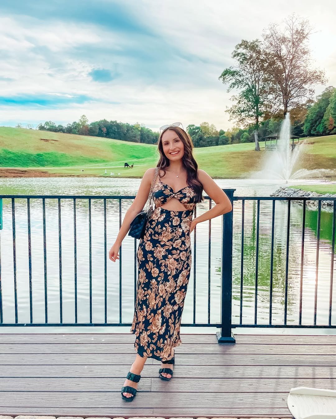 With soft waves, delicate heels, and a quilted shoulder bag, the whole outfit carries that relaxed elegance that works perfectly for outdoor receptions. It’s equal parts polished and playful.