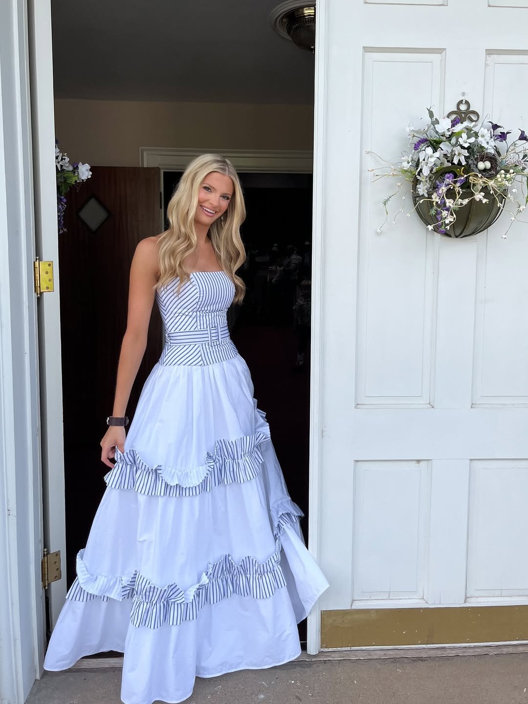 This white and blue striped gown has a breezy coastal elegance that feels straight out of a seaside wedding. The structured bodice paired with the full layered skirt creates a silhouette that feels both playful and polished.