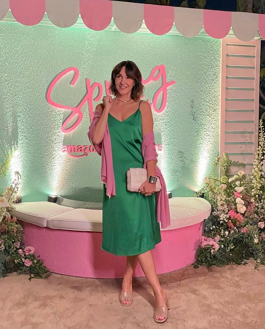 Not every wedding guest look has to be whisper-soft pastels. Sometimes a rich emerald dress paired with playful layers makes the entire outfit feel alive. The pink cardigan draped over the shoulders adds just enough contrast to turn a simple slip into something memorable.