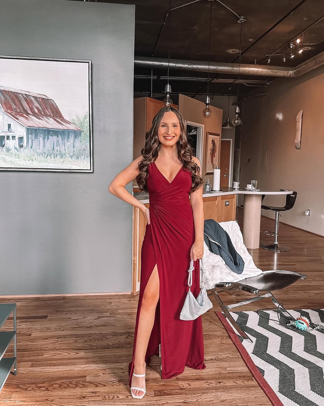Silver heels and a pearl-like clutch add just the right amount of sparkle. It’s the type of outfit that feels elegant enough for formal weddings but still playful enough to feel celebratory.