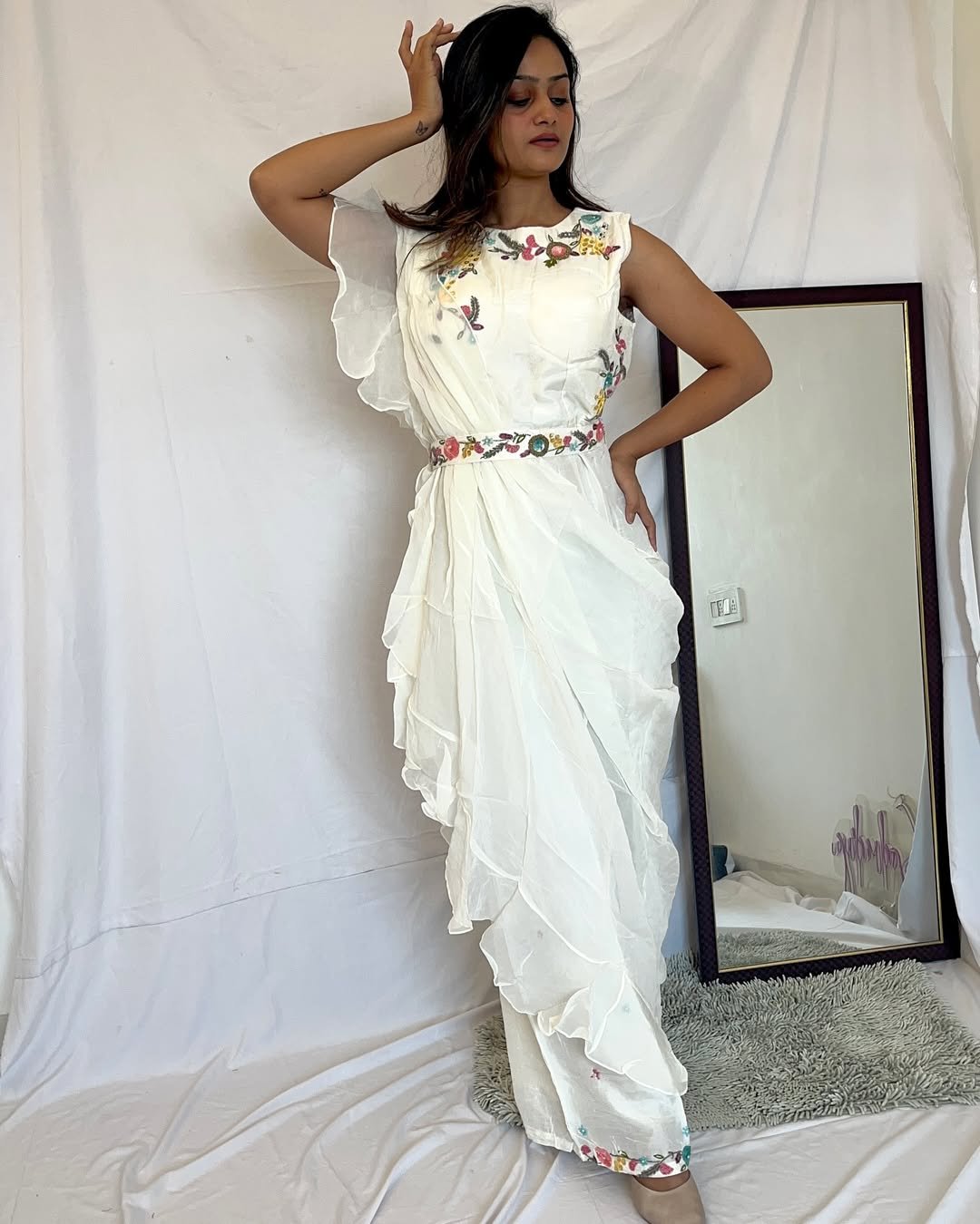 This flowing ivory ensemble feels almost dreamlike. The cascading layers, soft embroidery, and delicate waist detail create a silhouette that feels romantic without being overly traditional.