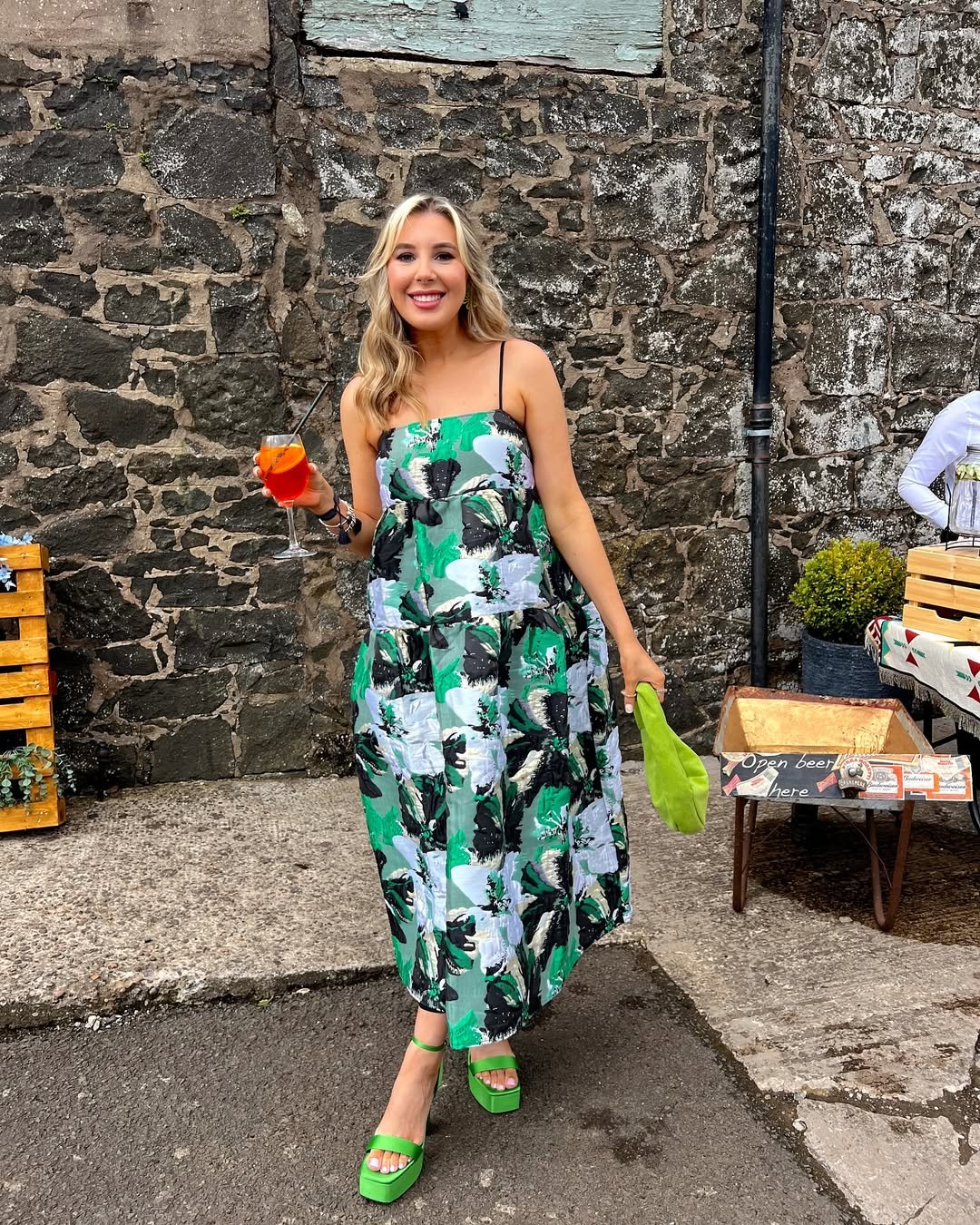 Sometimes a bold print is exactly what a wedding guest outfit needs. This graphic green and black dress has that striking visual energy that instantly makes the look feel lively and memorable.