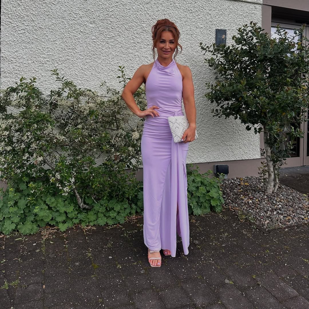 Soft lavender always brings a touch of romance, and this sleek gown does it with confidence. The halter neckline and flowing drape create a silhouette that feels modern yet graceful, especially paired with a textured clutch and minimal heels.
