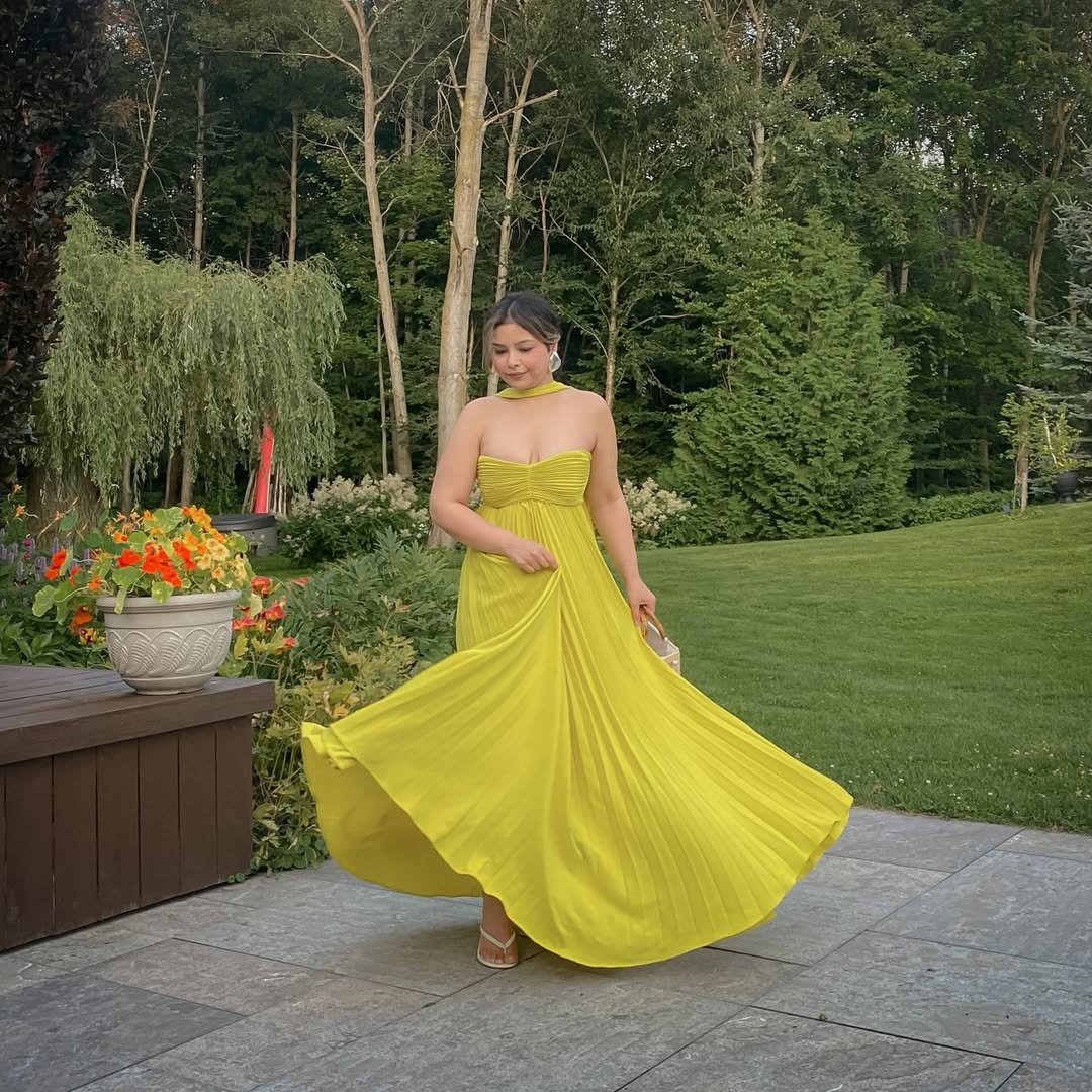 Standing beneath leafy vines and warm sunlight, the outfit feels effortlessly elegant. It’s the kind of dress that doesn’t need bold accessories to shine, the fabric and silhouette already do all the work.