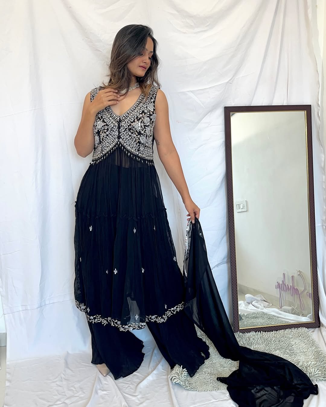 What makes it work so beautifully is the balance. The silhouette stays sleek and modern while the intricate pattern brings just enough drama. Add a pair of simple heels and a few gold bangles, and suddenly you have a look that feels perfectly at home at a vibrant reception or sangeet night.