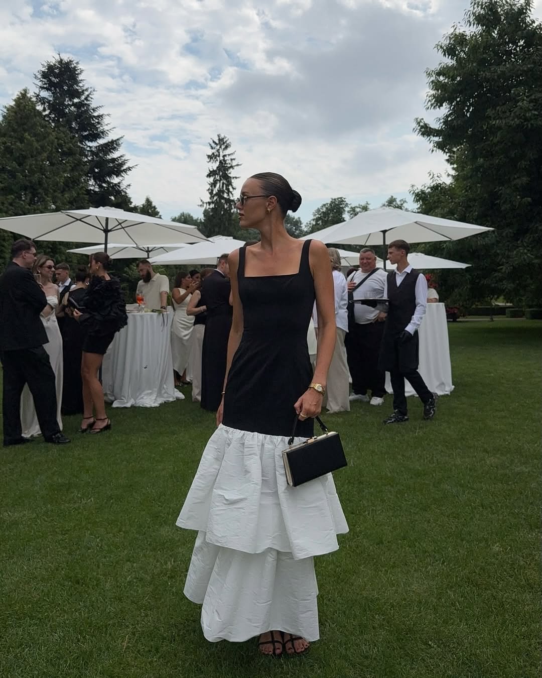 The sleek bun, sunglasses, and classic clutch elevate the entire look into something quietly powerful. It’s the kind of outfit that blends into an elegant garden party while still making you look like the most polished guest in the room.