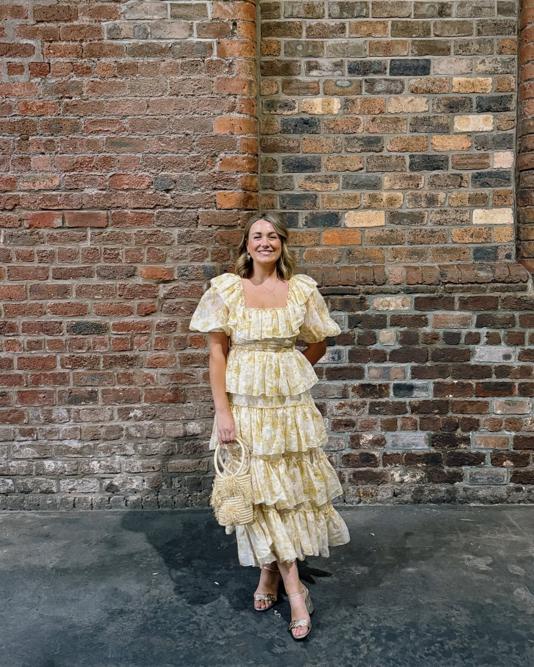 This sunshine-soft yellow dress feels like the perfect companion to a summer ceremony. The cascading ruffles, airy fabric, and soft movement give the whole look a playful romance, especially when paired with that charming woven handbag and a delicate parasol.