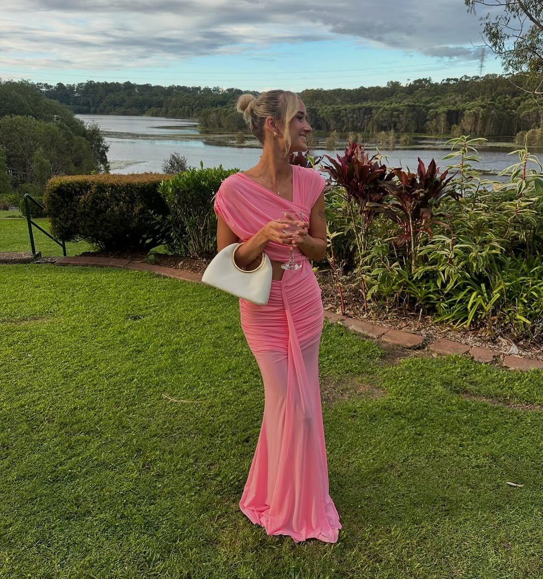 There’s something effortlessly glamorous about a soft pink gown that hugs and drapes in all the right places. The asymmetric neckline and gathered detailing create a silhouette that feels sleek and modern, especially against a dreamy outdoor backdrop.
