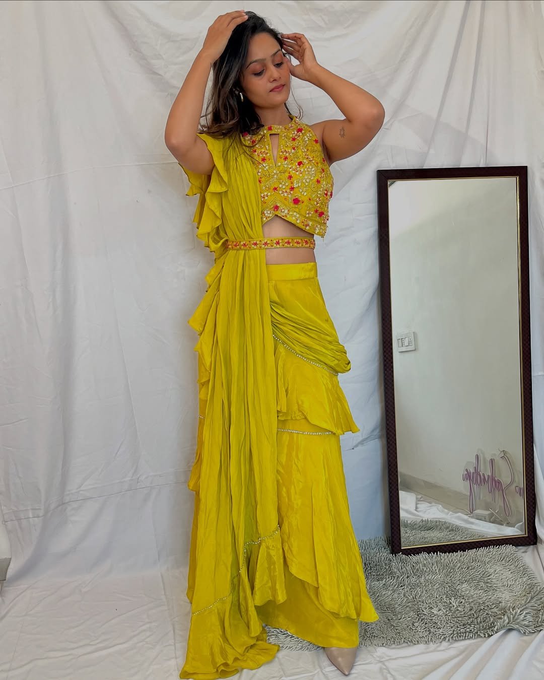 What really makes it shine is the movement in the fabric. The cascading layers and soft drape bring energy to the outfit, while the delicate embroidery keeps it elegant. It’s bold, joyful, and exactly the kind of look that belongs on a dance floor surrounded by marigolds and music.