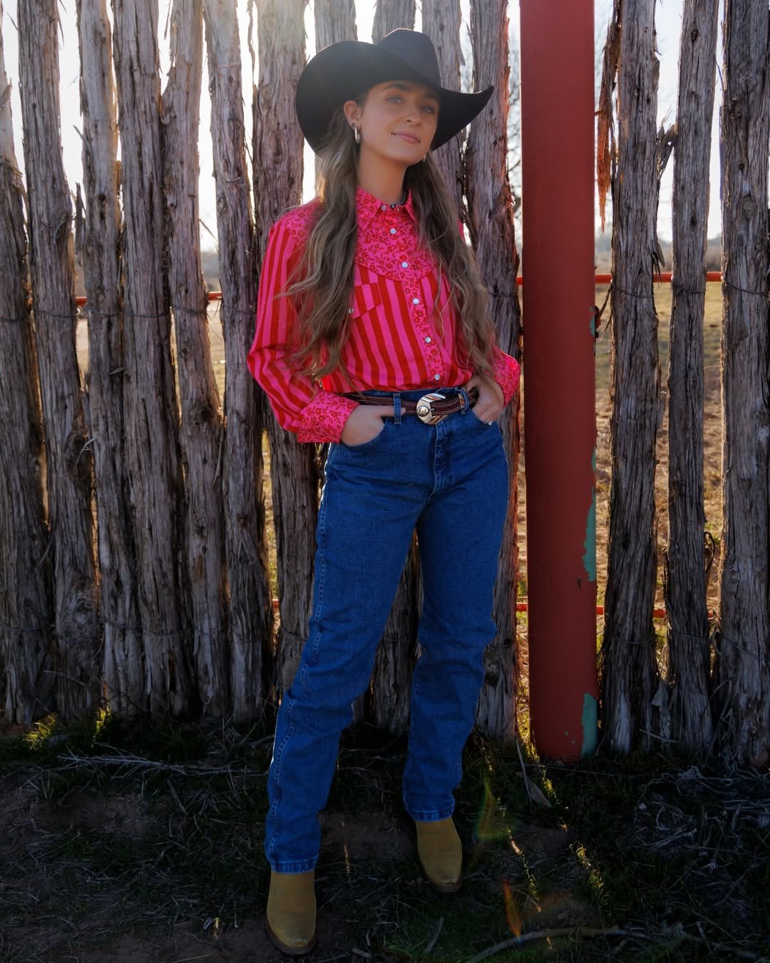A hot pink Western shirt with striped detailing, high-waisted jeans, and a black hat against a rustic fence. It’s bright, unapologetic, and completely magnetic.