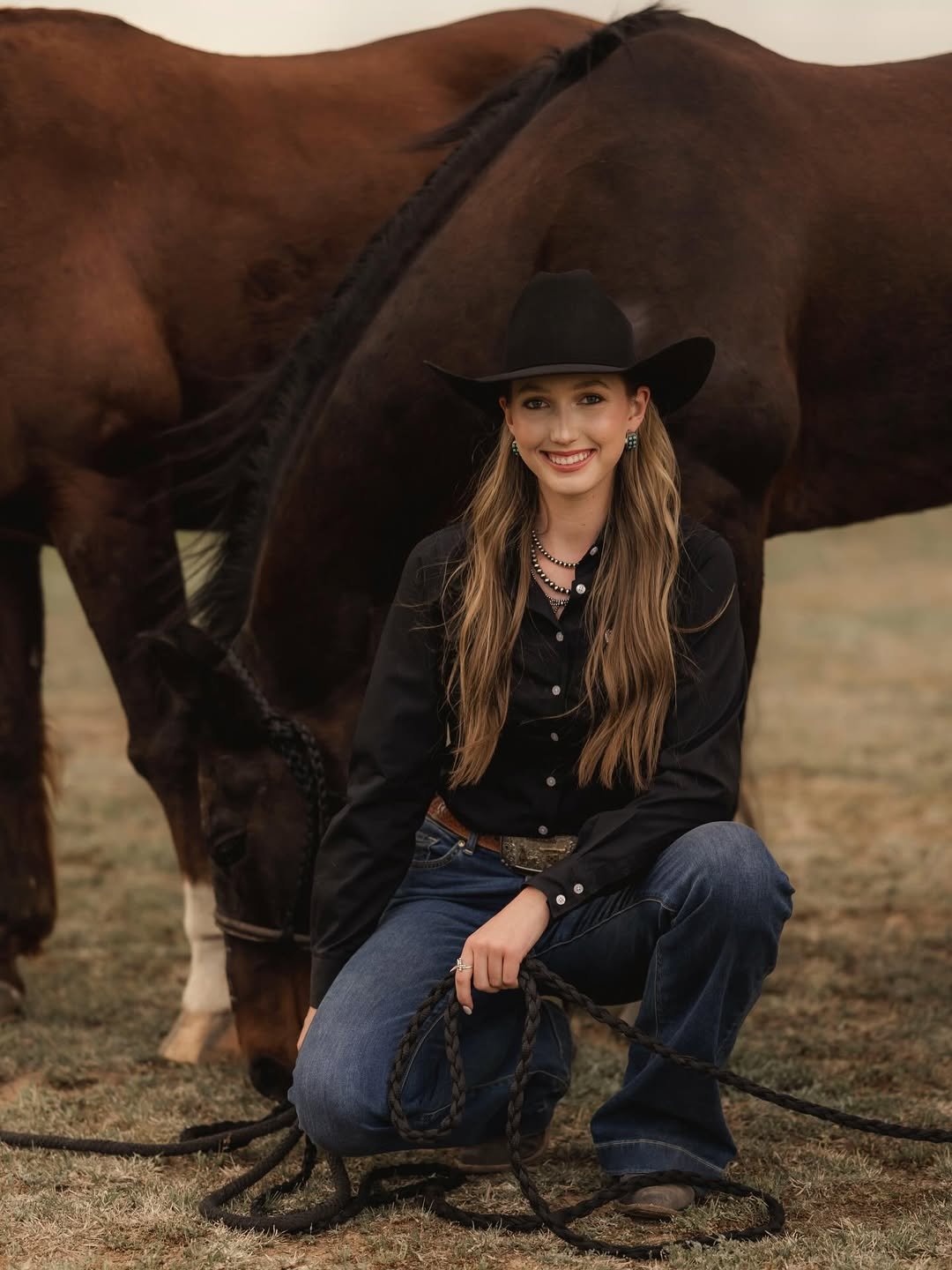 Black button-down, blue jeans, a structured belt, and a black hat, posed in front of a horse. It’s clean, timeless, and rooted in tradition.