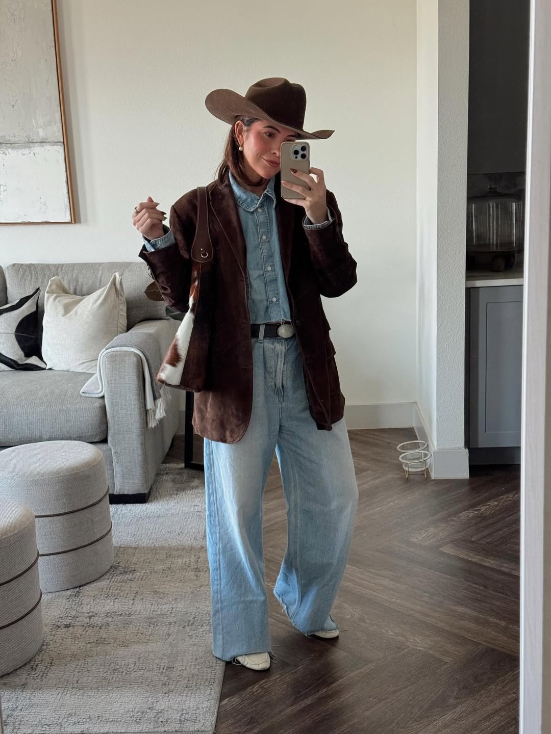 A chocolate suede blazer over a crisp denim shirt and wide-leg jeans, topped with a rich brown hat. It’s that timeless Western formula that never misses. The belt buckle and layered tones add depth without overcomplicating it.