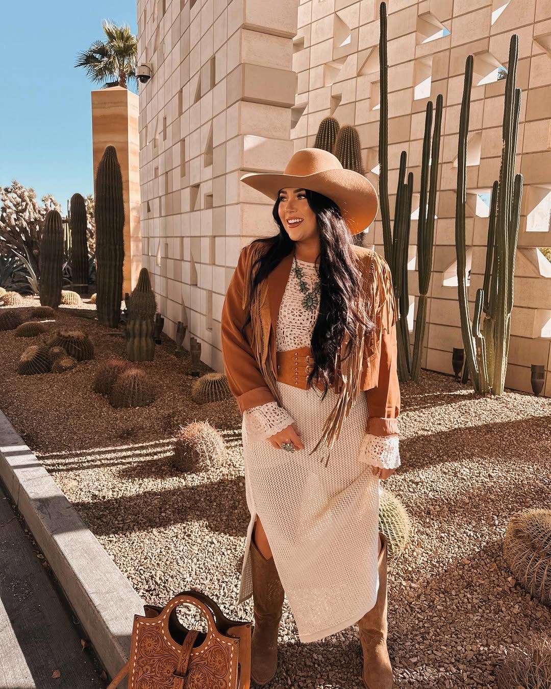 Cream crochet, a wide belt, and a cropped fringe jacket set against towering cacti. The warm tan hat and boots echo the desert tones, creating this layered, earthy palette that feels right at home.